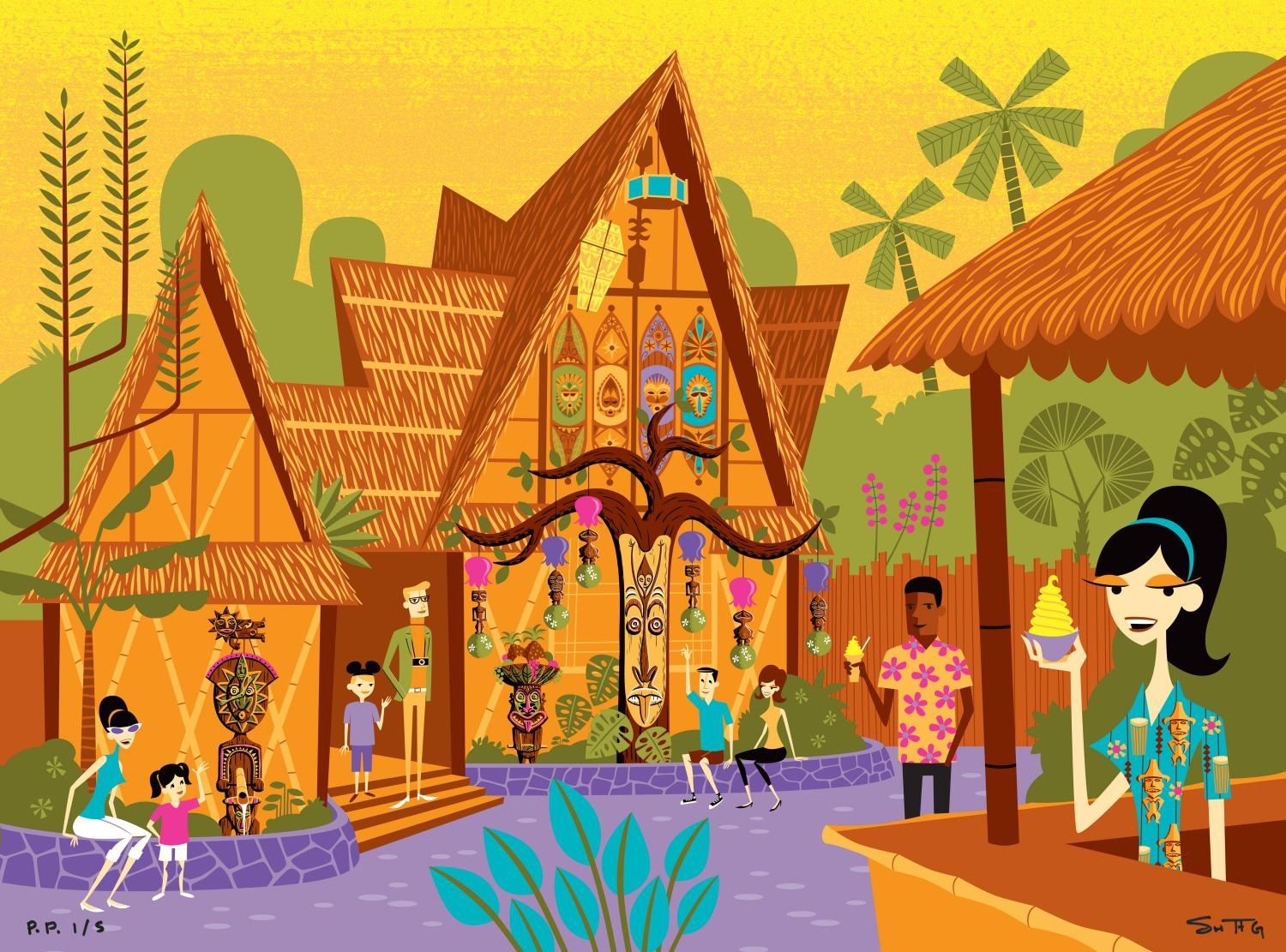 (Disneyland, 2013) A signed"Tropical Hideaway" print by SHAG for the 50th anniversary of Walt Disney’s Enchanted Tiki Room. SHAG hand-signed the bottom right of the printer's proof, numbered 1 of only 5. Measuring 27" x 20", the giclee on canvas print is in fine condition.
