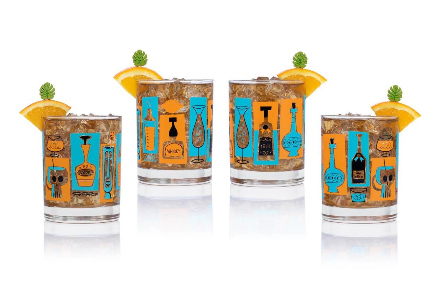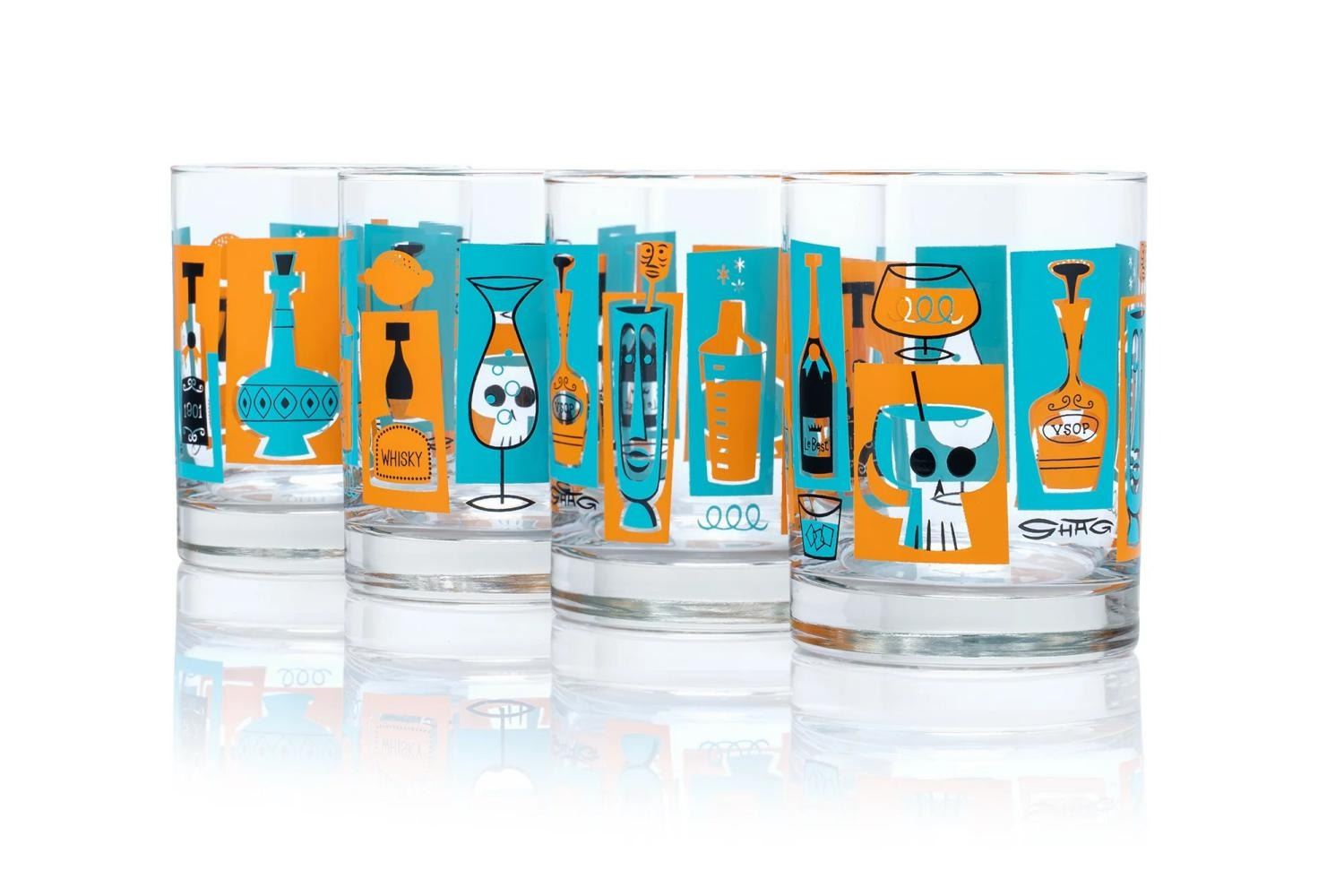 (SHAG, 2010s-20s) A four-piece "Happy Hour " Old Fashioned glass set designed by SHAG. Measuring 4 " tall and 3 " in diameter, the 14 oz glasses are in fine condition.