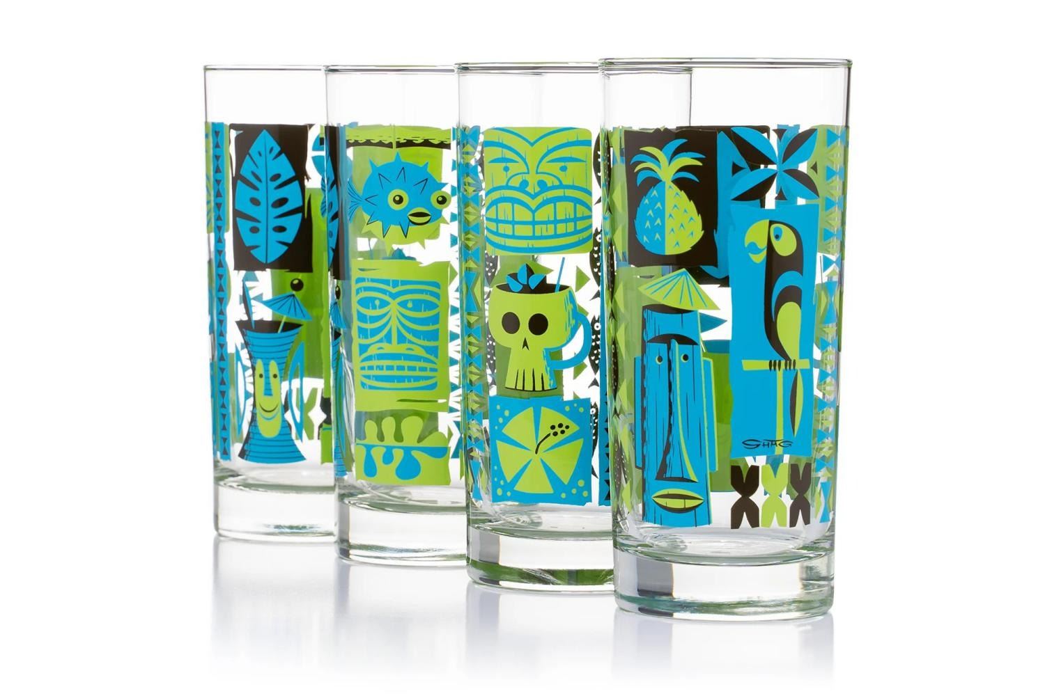 (SHAG, 2010s-20s) A four-piece "Tapa " Tiki Highball Glass set designed by SHAG. Measuring 6 " tall and 3 " in diameter each, the 16oz glasses are in fine condition.