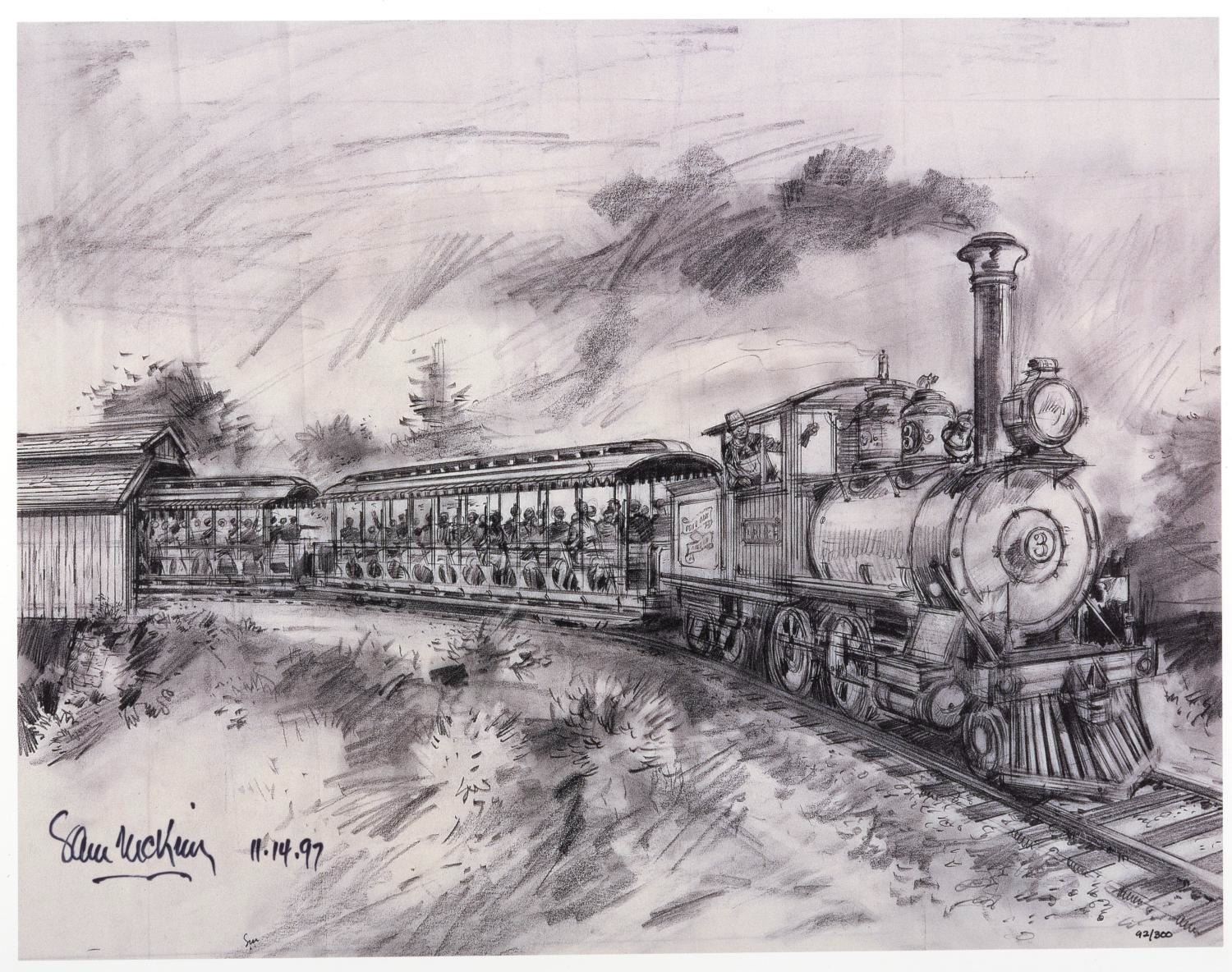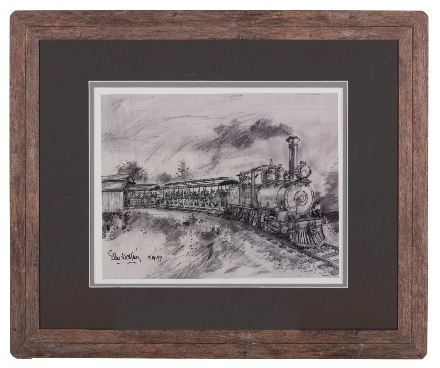 (Disneyland, 1997) A limited edition lithograph of a Fred Gurley locomotive drawing by Imagineer Sam McKim. It was released through the Disney Gallery and is hand-numbered 92/300 with McKim's signature in ink in the bottom-left corner. Measuring 9.75"x12.75" in the 16.75"x19.75" frame, the signed lithograph is in fine condition.