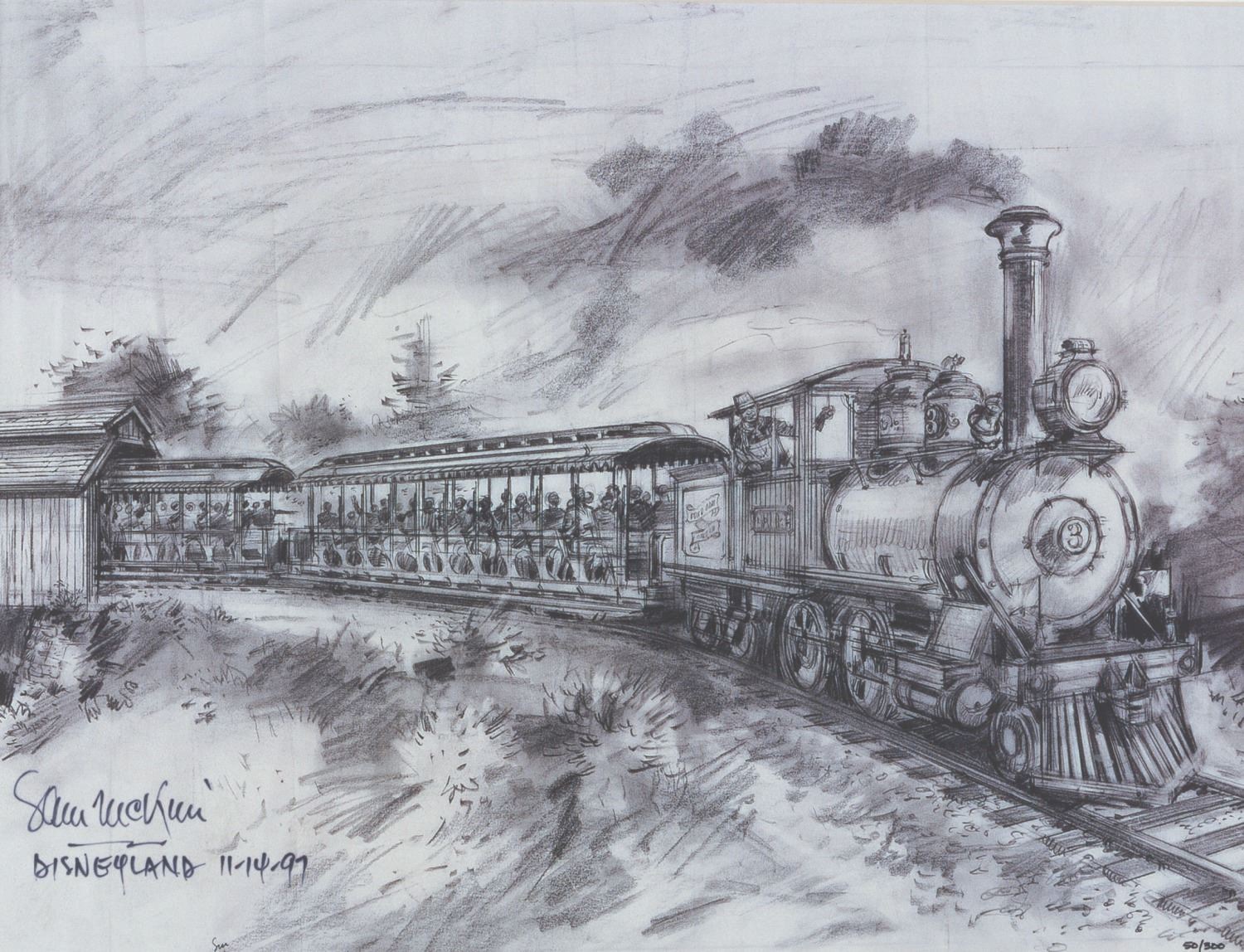 (Disneyland, 1997) A limited edition lithograph of a Fred Gurley locomotive drawing by Imagineer Sam McKim. It was released through the Disney Gallery and is hand-numbered 50/300 with McKim's signature in ink in the bottom-left corner. Measuring 9.5" x 12.5" in a 20" x 22.75" matted frame, the lithograph is in fine condition.
