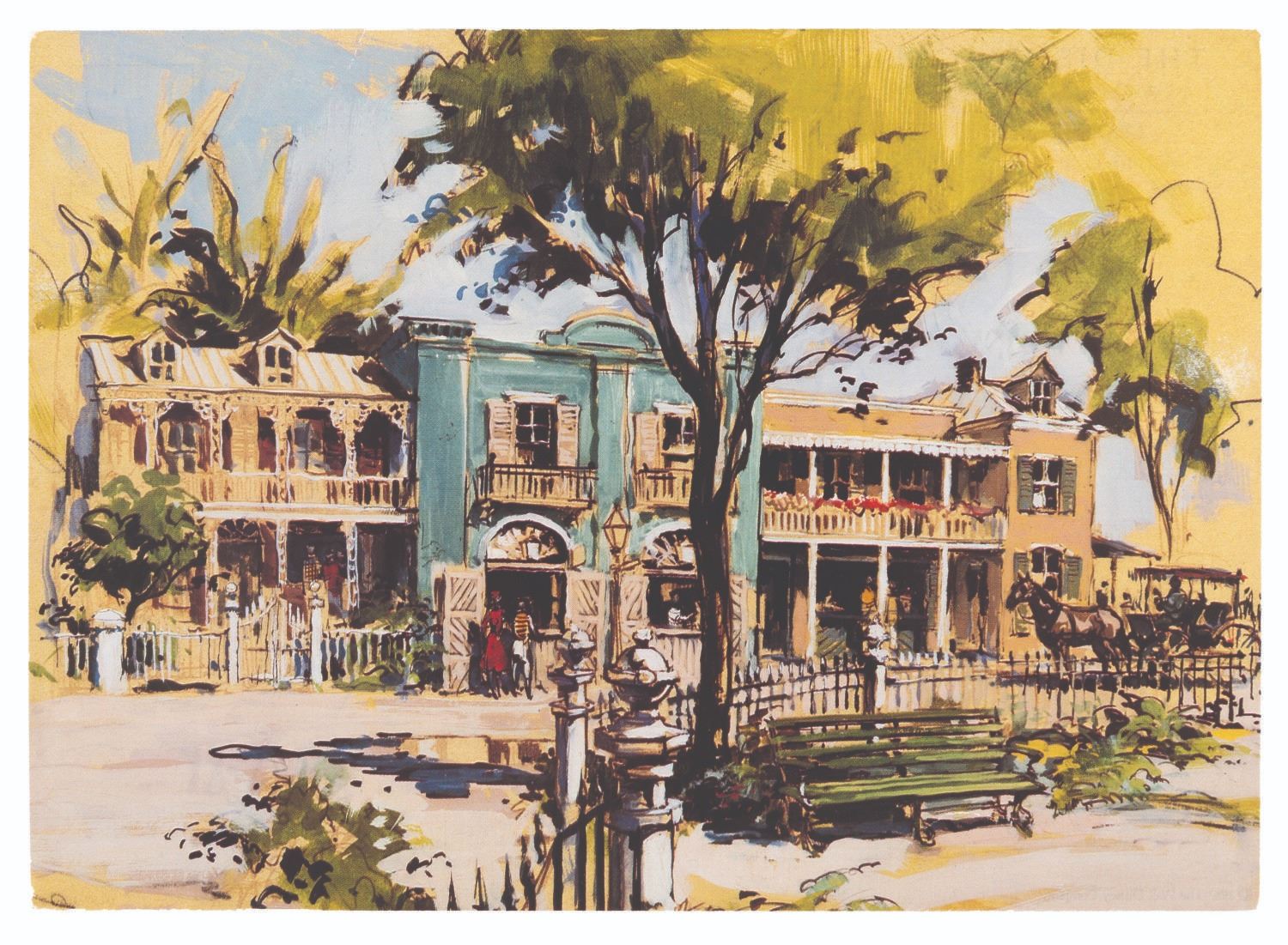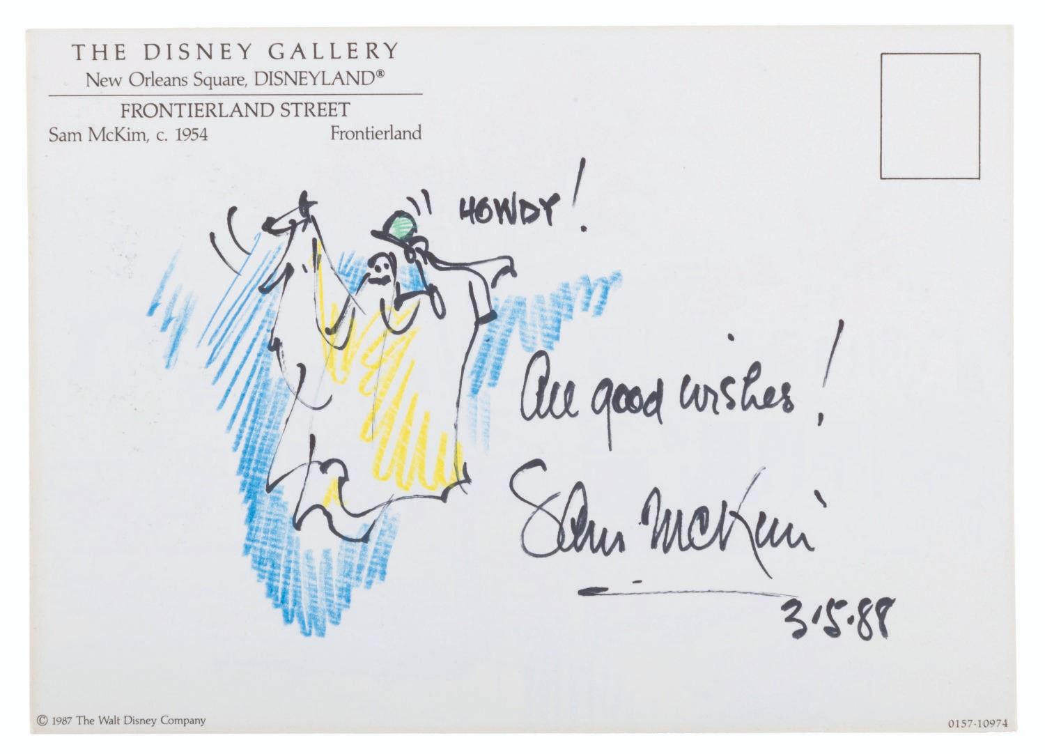 (Disneyland/McKim, 1987-88) A Disney Gallery postcard of Sam McKim’s 1954 concept art for Frontierland Street, signed by the Disney Legend in 1988. McKim drew a ghost saying “Howdy!” on the reverse in colored markers and signed the postcard with a dedication to a fan in black marker. Measuring 5” x 7”, the signed postcard displays in very good condition with light creases, edge wear, and discoloration from age.