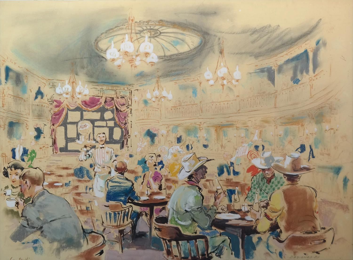 (Disneyland, c.1954-55) An original concept painting of the interior of Disneyland's Golden Horseshoe Saloon by Imagineer Sam McKim. For this artwork, McKim painted over a brownline print of his original pencil outlines to create this vibrant and easily recognizable image of the attraction. This original painting was more recently reproduced as decor for the Disneyland Hotel, as well as for commercial prints. This original artwork was officially sold through the Disney Gallery at Disneyland in 1988, and the painting is still in its original frame with a WED archive label attached to the reverse. Although McKim is best known to fans as the creator of the oversize souvenir maps that have become a Disneyland tradition, he also contributed to several attractions throughout the park, and some of the first paintings he created as an Imagineer were of the Golden Horseshoe. This painting has an image size of 25.5"x34.5" within a 38.5"x46.5" frame. The condition is very good, with some expected fading to the brownline from age, and some moisture discoloration to the back of the frame. The painting is signed by McKim in the lower-left corner.
