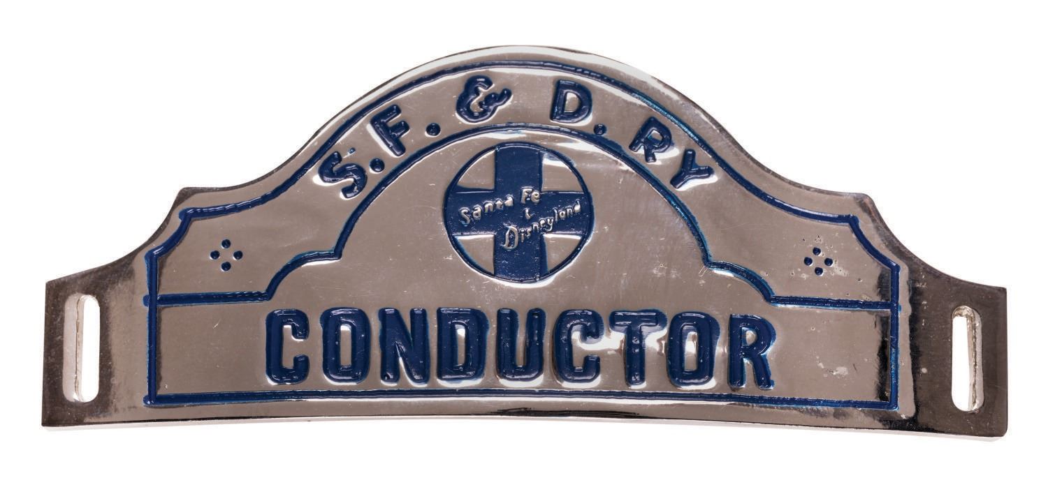 (Disneyland, 1955-1974) A Santa Fe & Disneyland Railroad Conductor Hat Badge. The metal badge is the style affixed to the crown of Conductors' hats from 1955 to 1974, when the Atchison, Topeka and Santa Fe ended Participant Sponsorship with Disneyland. Measuring 4"x1.75", the Cast Member badge is in fine good condition with minor wear from handling.