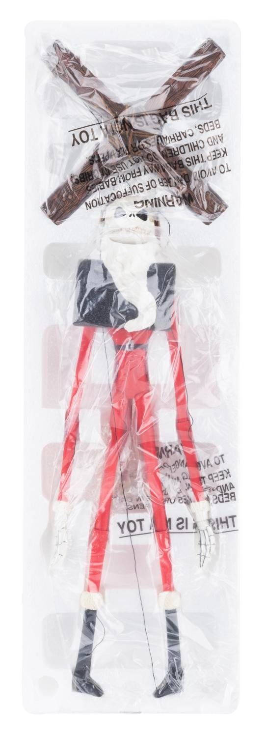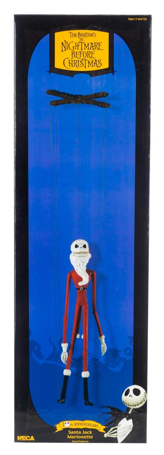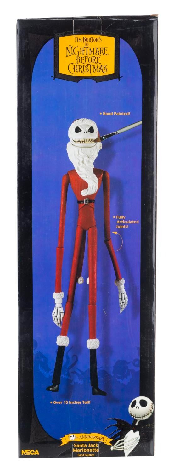(NECA, 2003) A hand-painted marionette of Jack Skellington as"Sandy Claws" from"Tim Burton's The Nightmare Before Christmas." The marionette of the Pumpkin King was released in 2003 for the 10th anniversary of the film. Measuring 4" x 2" and 16.5" tall, the marionette is in presumed fine condition still in the original 7" x 4" x 22.5" box.
