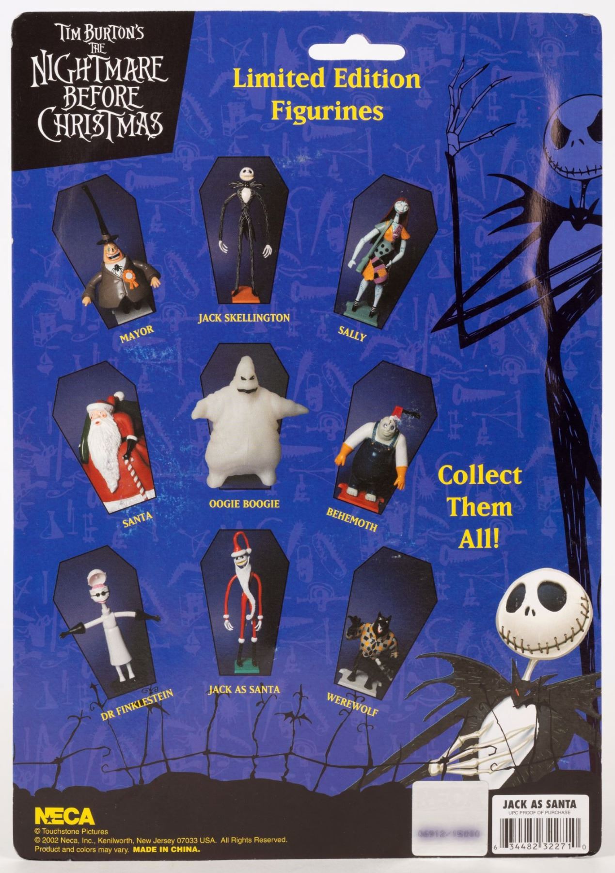 (NECA, 1990s-2000s) An action figure of Santa Jack Skellington from "Tim Burton's The Nightmare Before Christmas." The figurine was released in an unnumbered limited edition of 15000 by NECA and comes with a gravestone and a present accessory. The 5" x 1" and 10" tall figurine is in fine condition, sealed within the original 7.75" x 1.25" x 11" packaging.