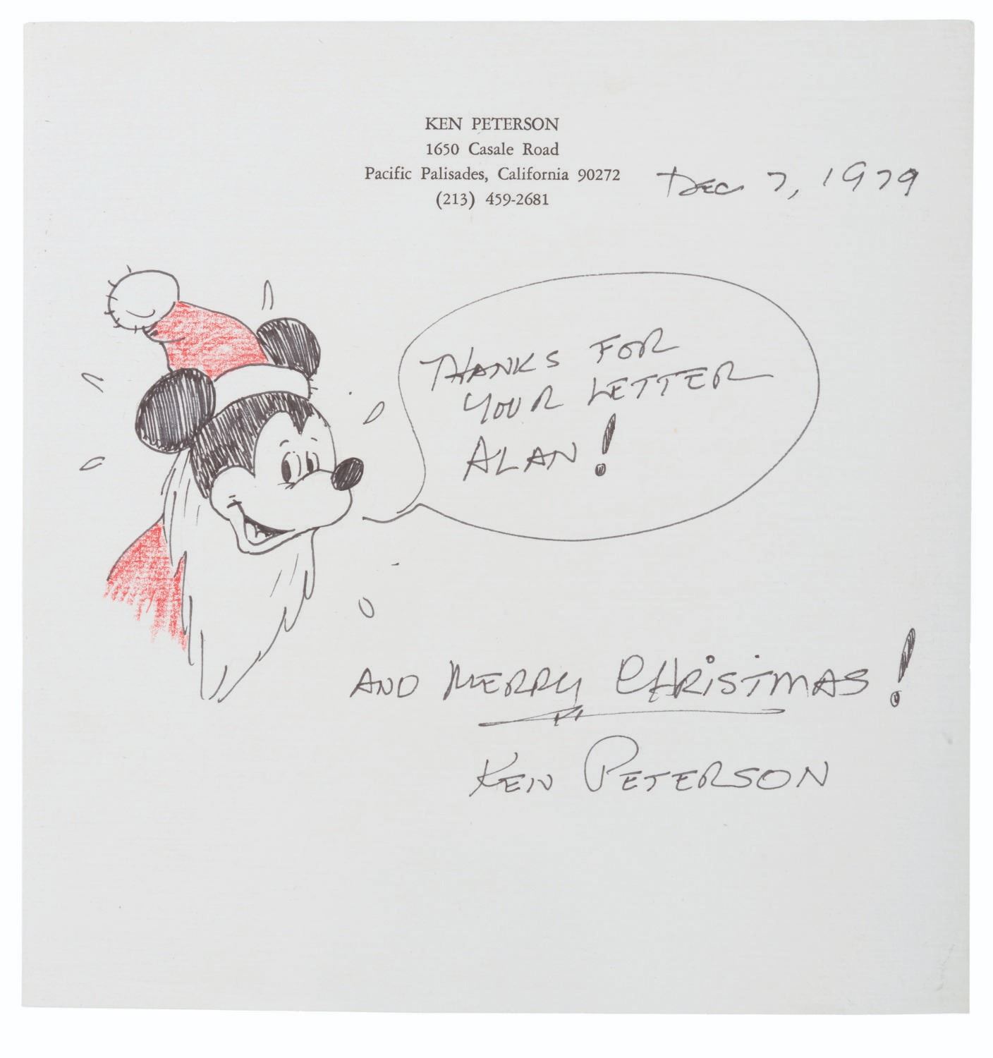 (Peterson, 1979) A personalized dedication and Santa Mickey drawing by animator Ken Peterson on his personalized letterhead. Accomplished in ink and color pencil, with a character image size of 2.5" x 3.75" on 8.75" x 9" letterhead, the art is in fine condition.