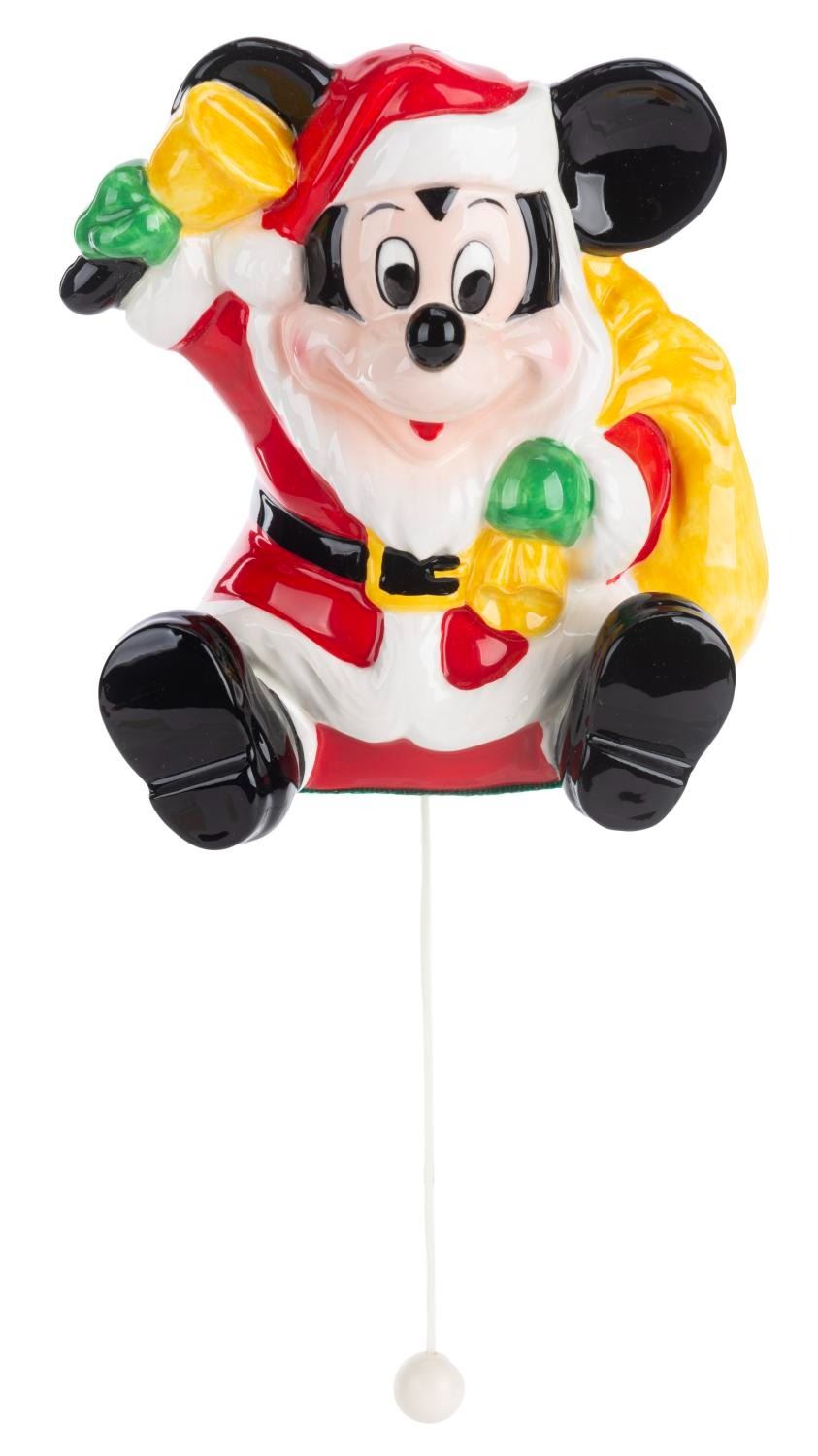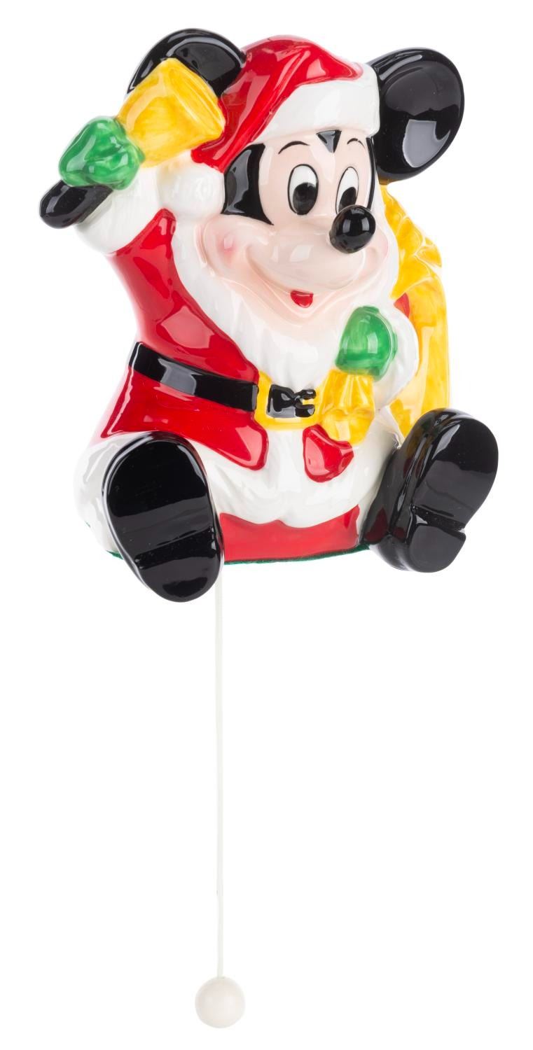 (Disney, 1970s-80s) A ceramic Santa Mickey Mouse wall hanging music box. When the string is pulled the "Jingle Bells” plays. Measuring 2.75” x 5” x 5.5” tall the wall hanging is in very good working condition with adhesive residue to the reverse.