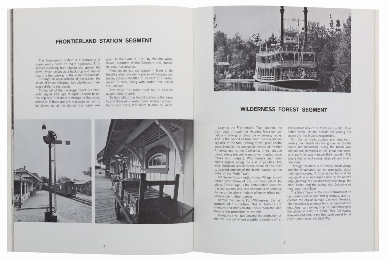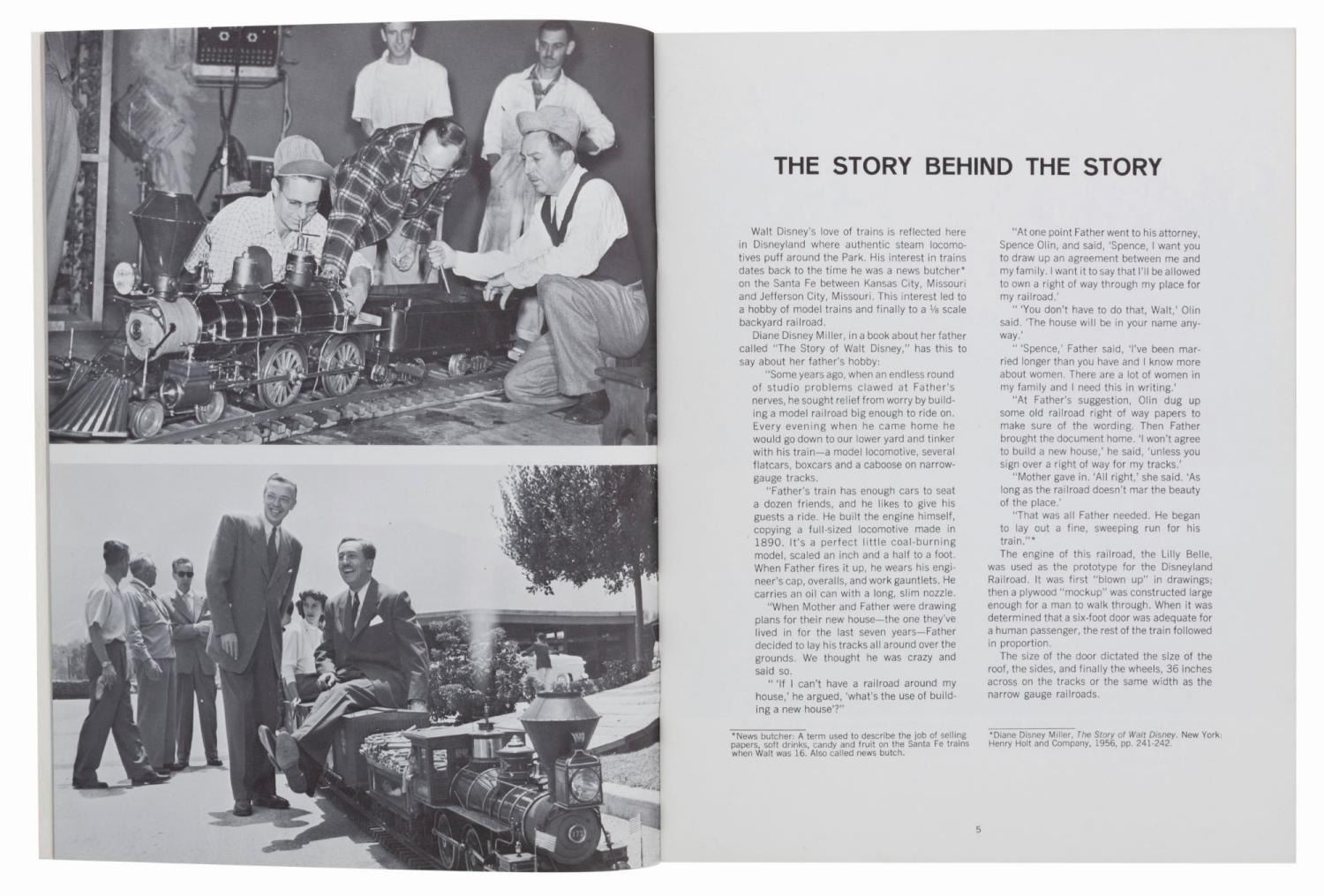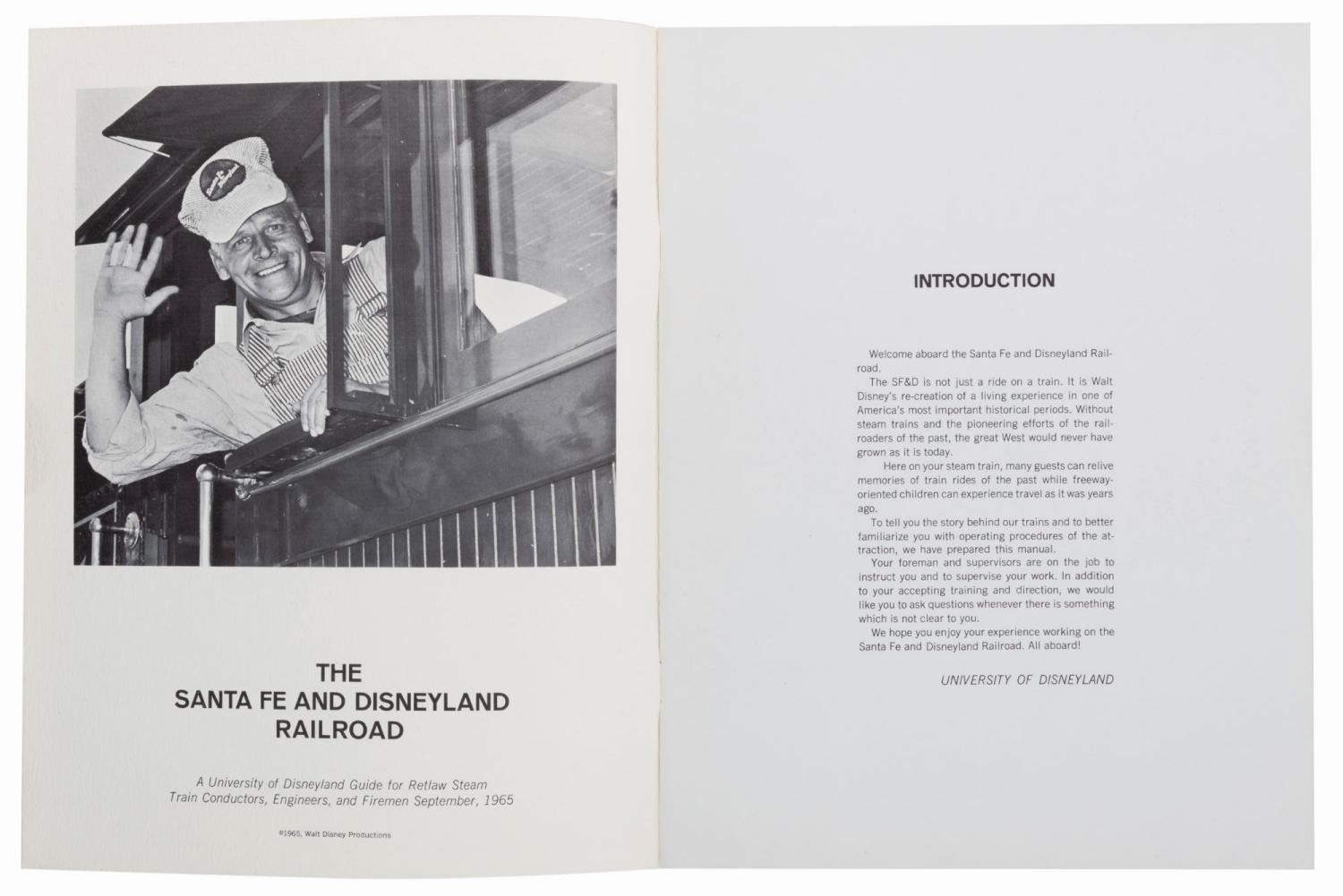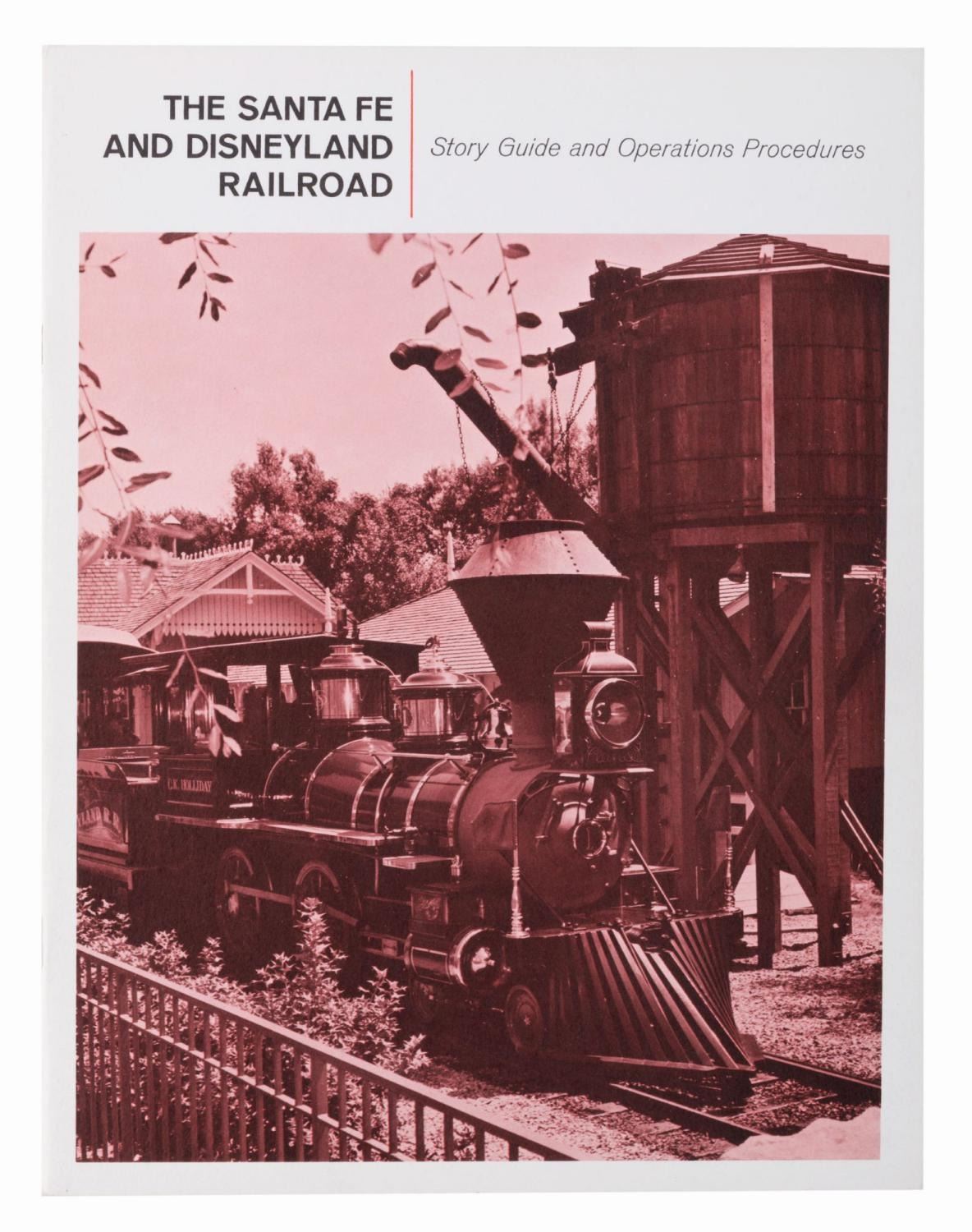 (Disneyland, 1965) A rare Santa Fe and Disneyland Railroad Story Guide and Operational Procedure booklet by Disneyland University, created for Retlaw Steam Train Conductors, Engineers, and Firemen. The 30-page booklet provides a detailed history of the railroad, featuring beautiful photographs, maps, signals, and even mentions a "new diorama with a prehistoric theme." Measuring 8.5" x 11", the booklet is in fine condition.