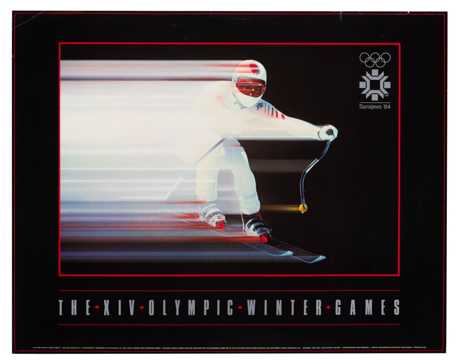 (Olympics, 1984) A poster of a skier for the 1984 Winter Olympics in Sarajevo, Yugoslavia. The poster was designed by Tony Hair with photographer David Brownell and photo effects by Peter Green. Measuring 22" x 28", the poster is in good condition with a few small creases throughout, and wear along the top, including a folded left corner and 0.5" tear in the edge.