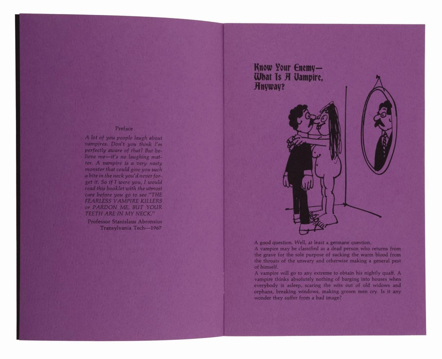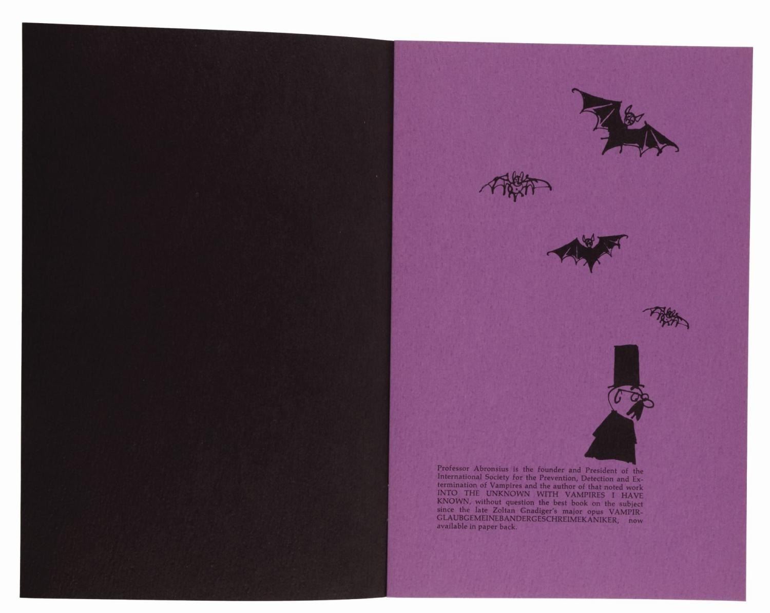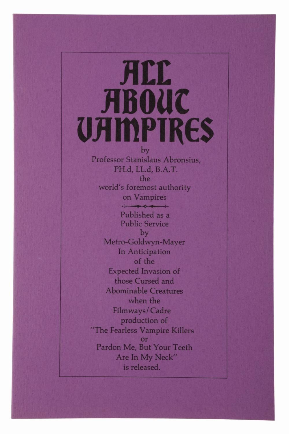(MGM, 1967) An amusing six-page pamphlet "All about Vampires," published to promote Roman Polanski's gothic, horror, comedy film "The Fearless Vampires." Measuring 5.5" x 8.5", the pamphlet is in fine condition.