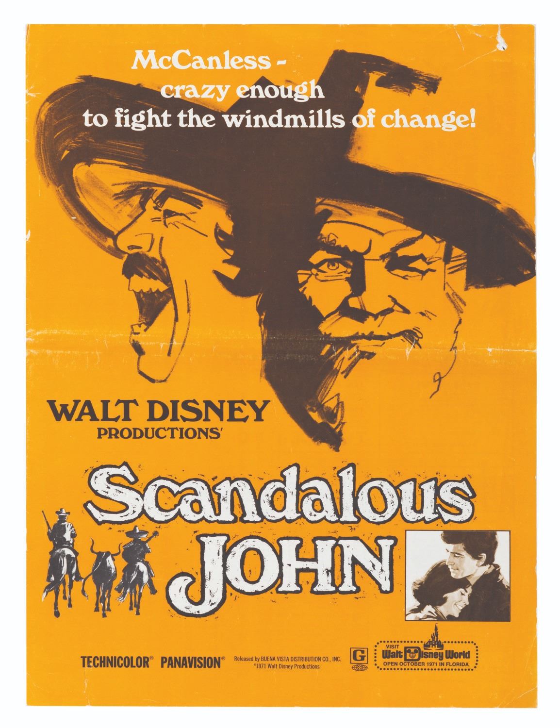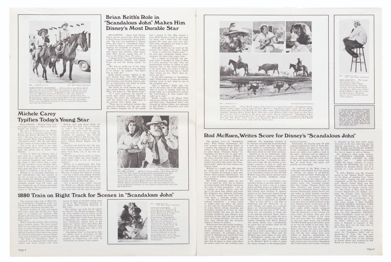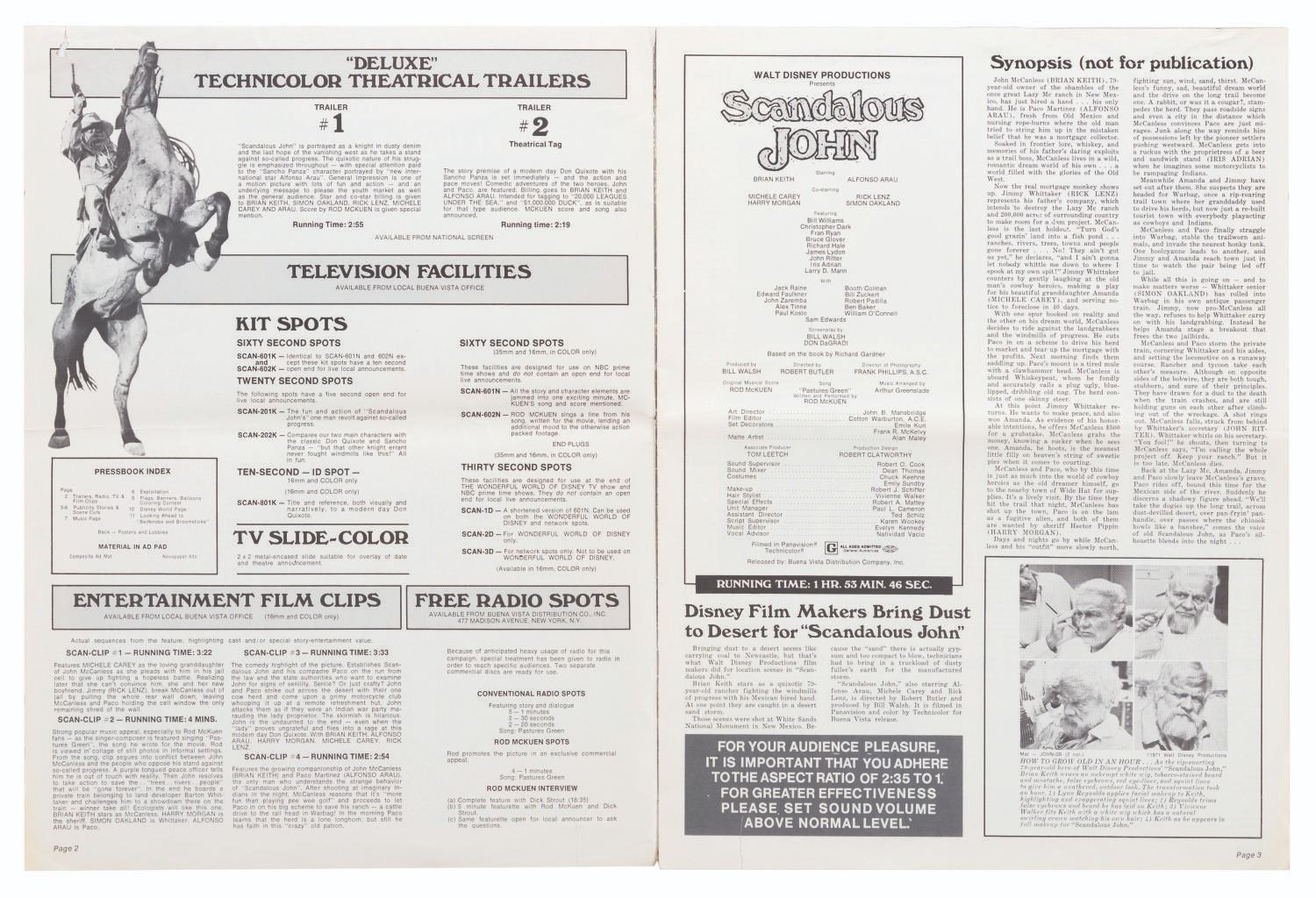 (Disney, 1971) A press book for the 1971 release of Disney's "Scandalous John," including resources for TV, radio, and film promotions, along with posters, accessories, publicity stories, tie-ins, and more related to the film's theatrical release. Measuring 11" x 14.75", the booklet is in good condition, with a fold across the center, creases and small tears to the edges, and handling wear throughout.