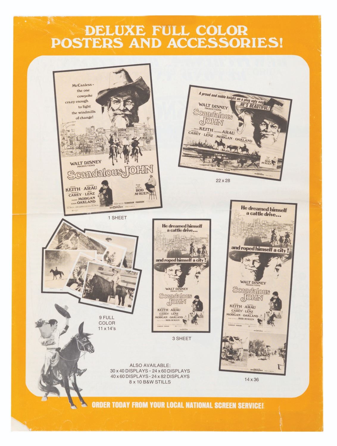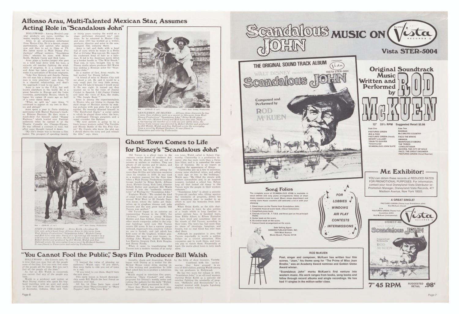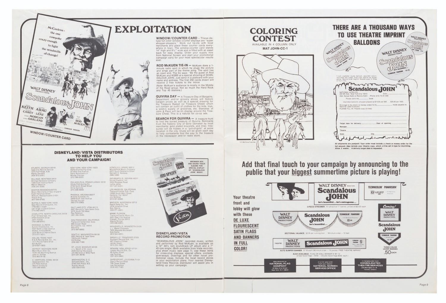 (Disney, 1971) A press book for the 1971 release of Disney's "Scandalous John," including resources for TV, radio, and film promotions, along with posters, accessories, publicity stories, tie-ins, and more related to the film's theatrical release. Measuring 11" x 14.75", the booklet is in good condition, with a fold across the center, creases and small tears to the edges, and handling wear throughout.