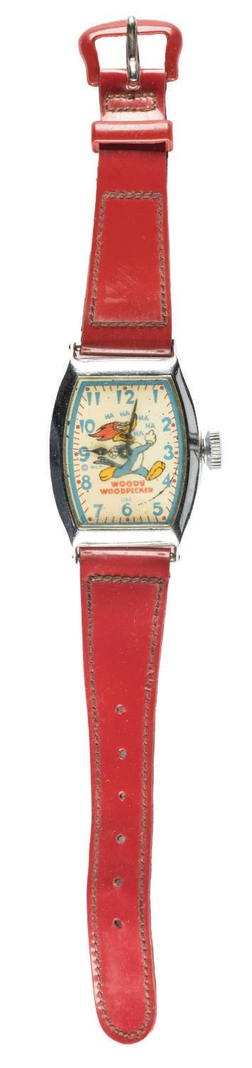 (Ingraham, 1940s) A very rare Woody Woodpecker watch by Ingraham. The 1.1"x1.5" silver luster metal case contains a full-color dial with a nice image of Woody Woodpecker with laughter behind him. It comes with the original red vinyl band which shows wear from use. There is light surface wear to the crystal, and when wound, the watch does run intermittently, but needs a full service. A great example of an extremely hard-to-find watch.