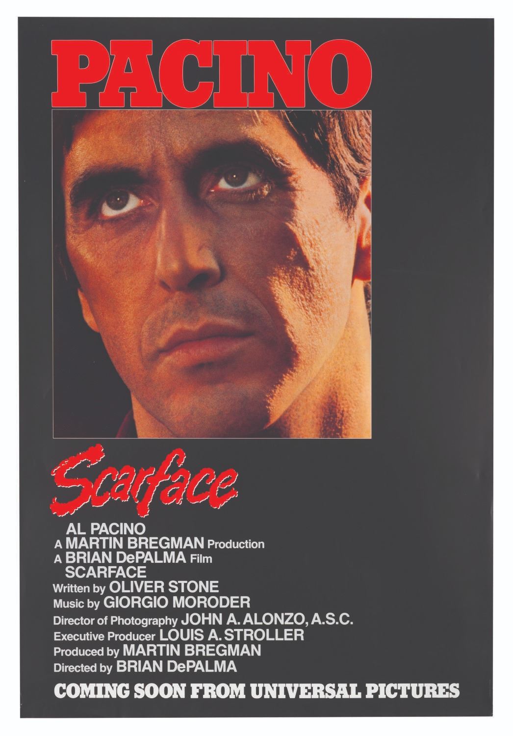 (Universal, 1983) An advance one-sheet for the Brian De Palma-directed gangster film "Scarface" starring Al Pacino. Measuring 27" x 39.75", the poster is in very good condition with light creases, scratches, and edge wear.