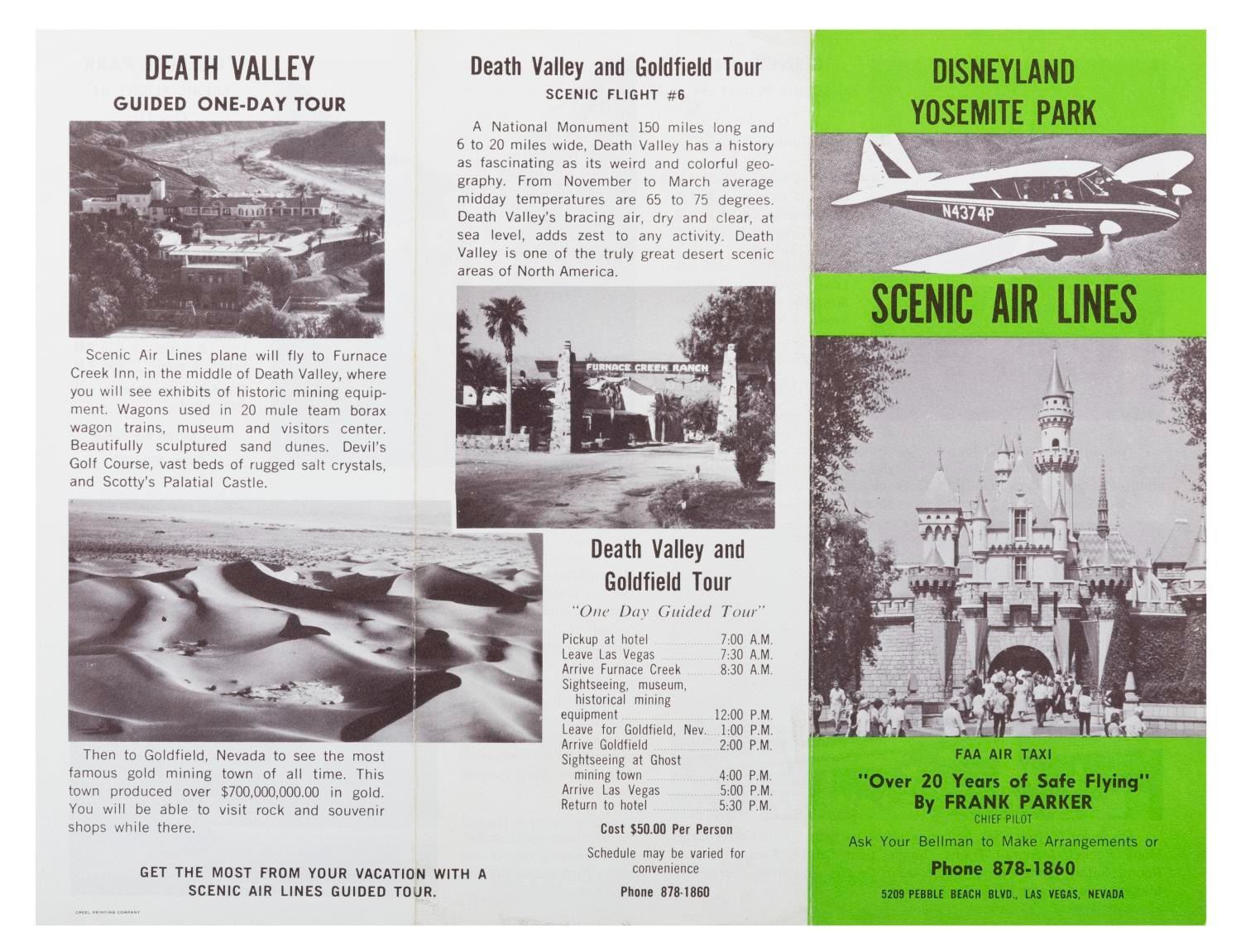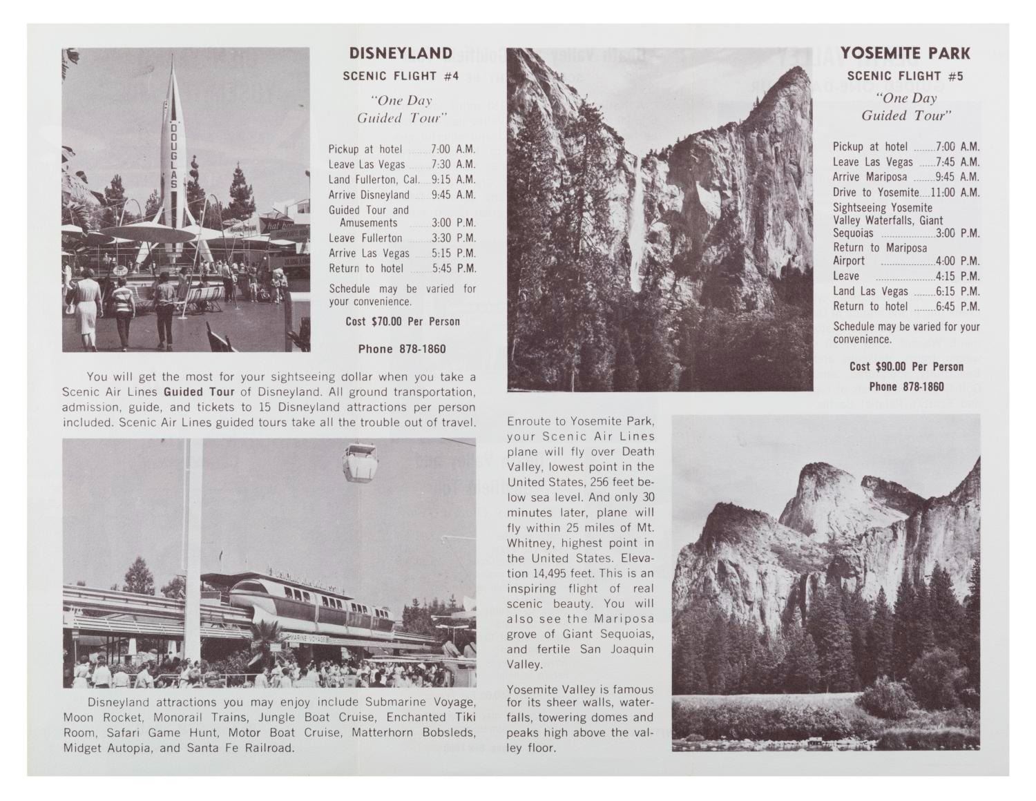 (Scenic Airlines, 1960s) A brochure for Scenic Airlines tours from Las Vegas to Disneyland, Yosemite and Death Valley. Measuring 8.5" x 11" the brochure is in very good condition with light edge wear and soiling.
