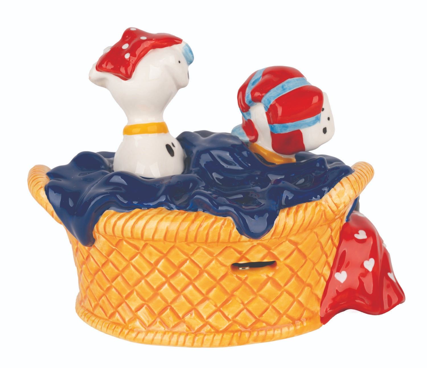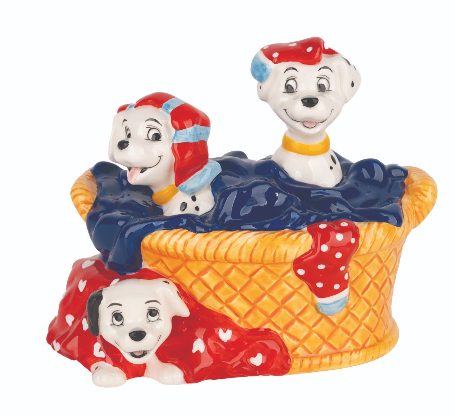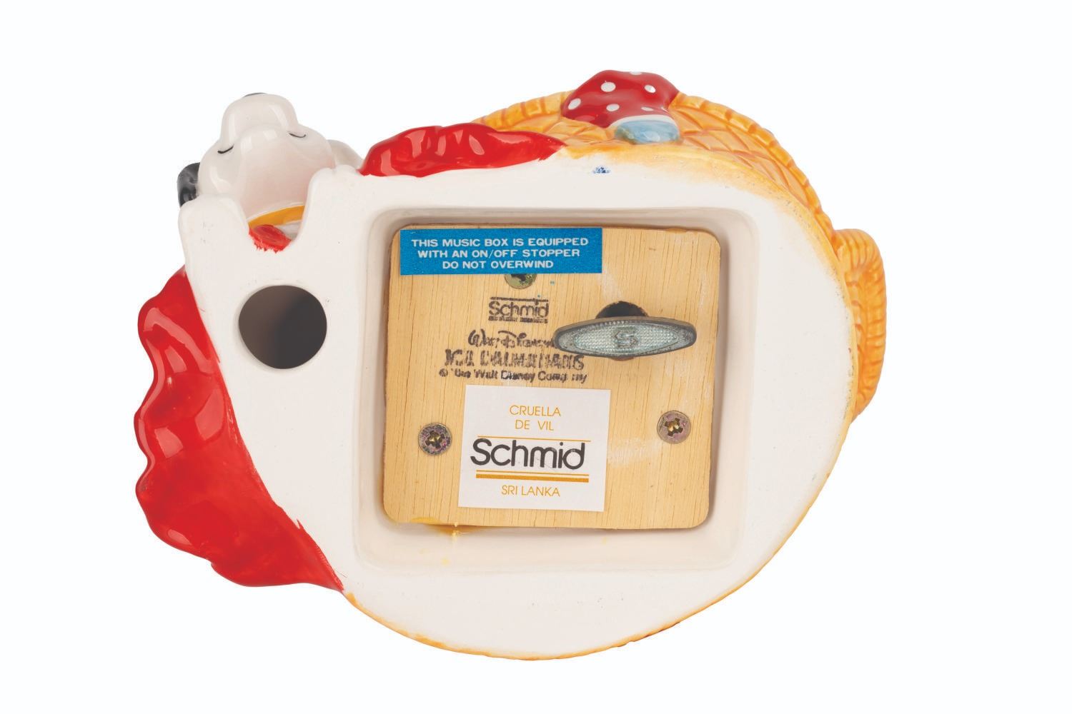 (Schmid, 1990s) A “101 Dalmations” ceramic music box that plays “Cruella de Vil” when wound. The music box played intermittently and at a slower-than-normal pace when tested. Measuring 4.5” x 6” x 4” deep, the figural music box displays in very good condition.