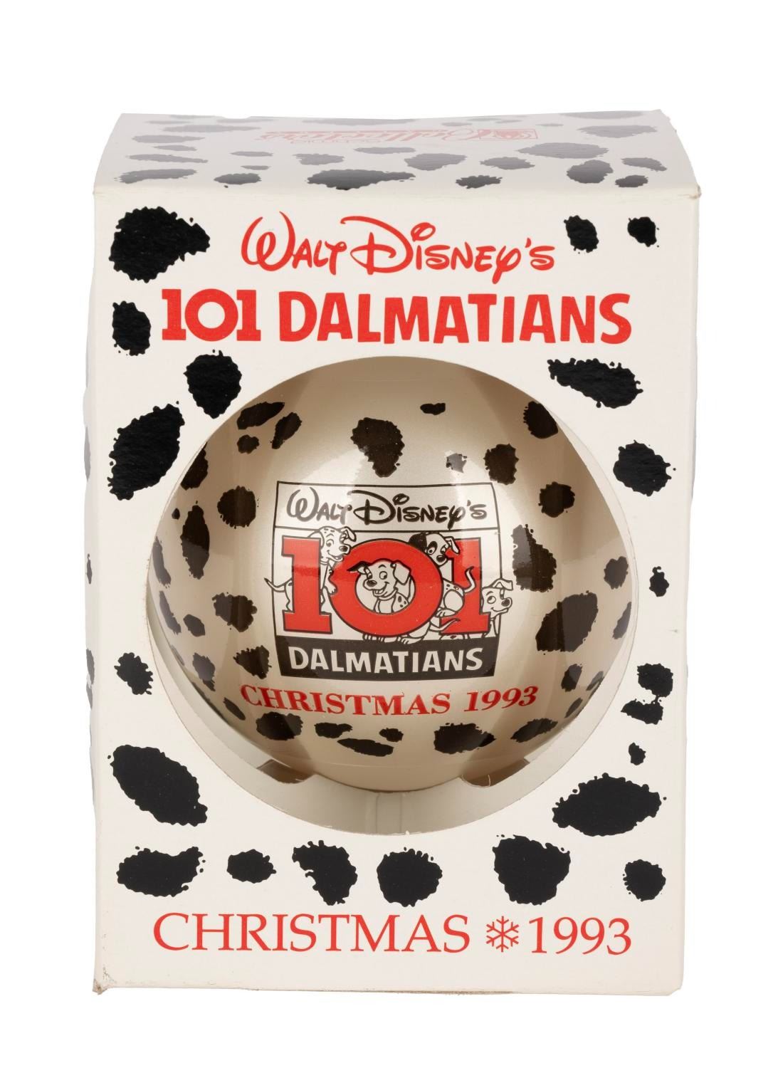 (Schmid, 1993) A “101 Dalmatians” Christmas 1993 glass ornament in the original decorative box. Measuring 3.5” in diameter, the ornament is in fine condition.