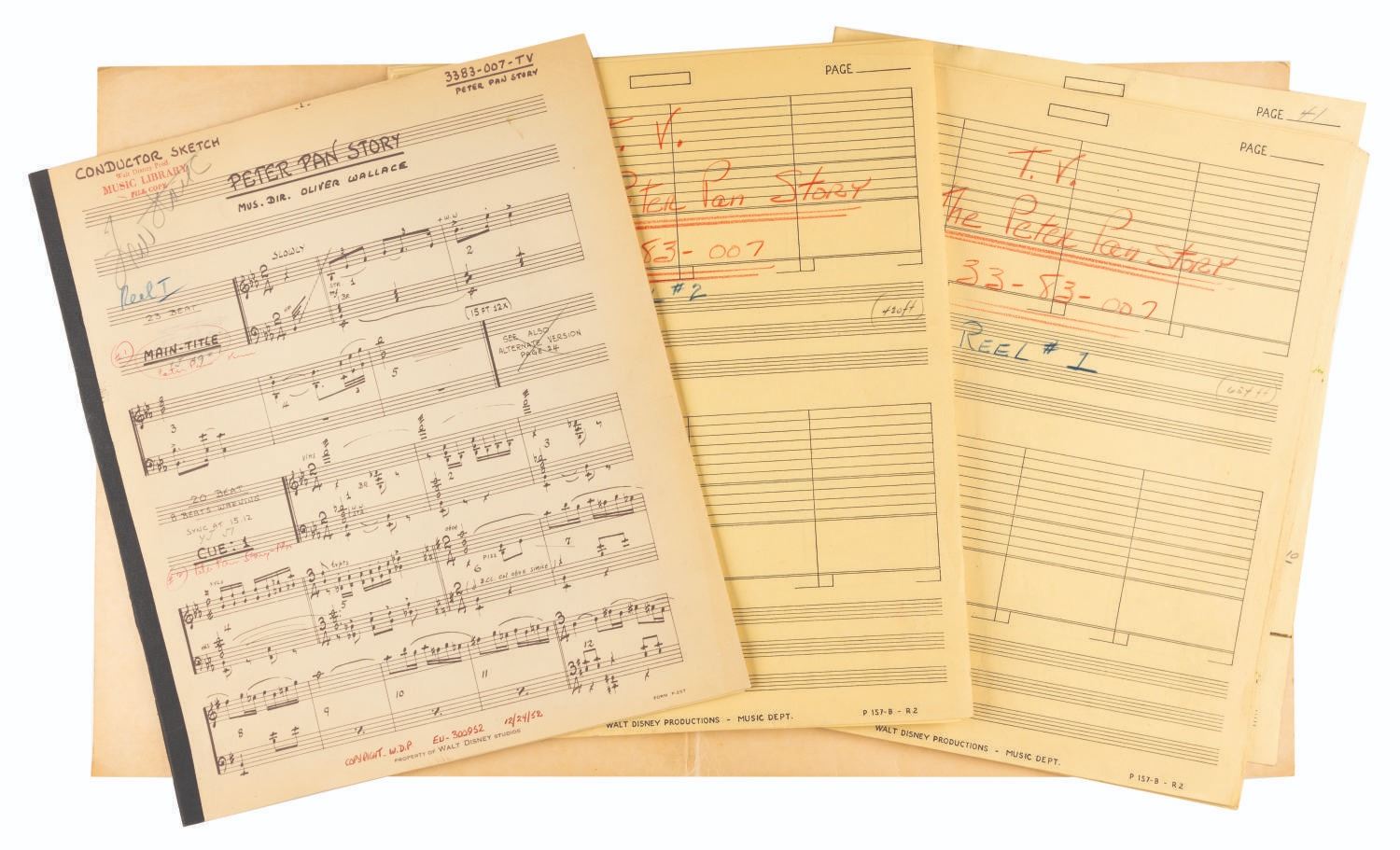 (Disney, 1953) A musical score for “The Peter Pan Story,” a TV featurette promoting the release of Walt Disney’s “Peter Pan” featuring clips from the film and behind-the-scenes footage from the production. Ranging in size from 14” x 11” to 14” x 12”, the scores are in very good condition with discoloration from age, light stains, wear, and tape on the spines from production use.