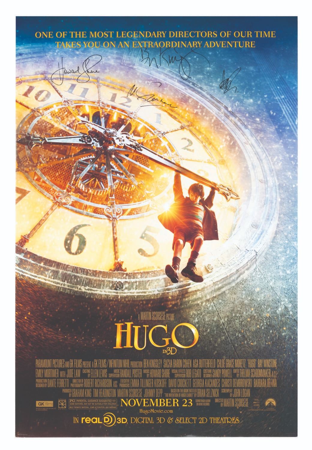 (Paramount, 2011) An original theatrical one-sheet for “Hugo” signed by producer and director Martin Scorsese, actors Ben Kingsley and Asa Butterfield, and composer Howard Shore. Measuring 27” x 40”, the foamcore-mounted poster displays in very good condition, with light edge wear typical of handling.
