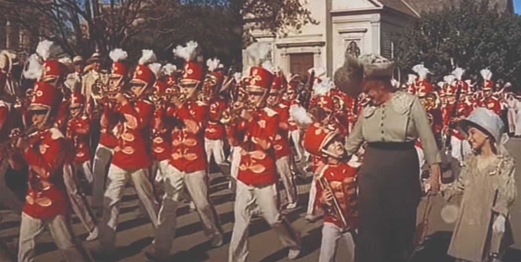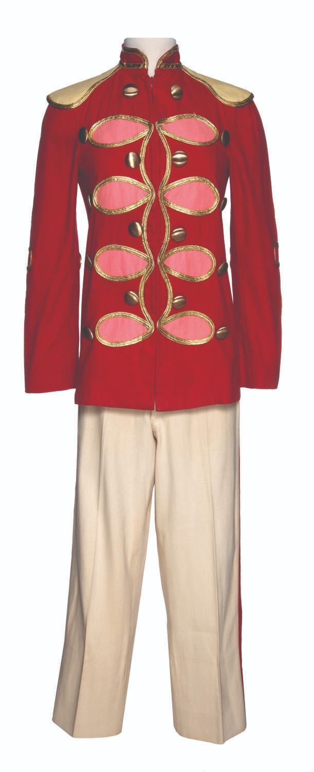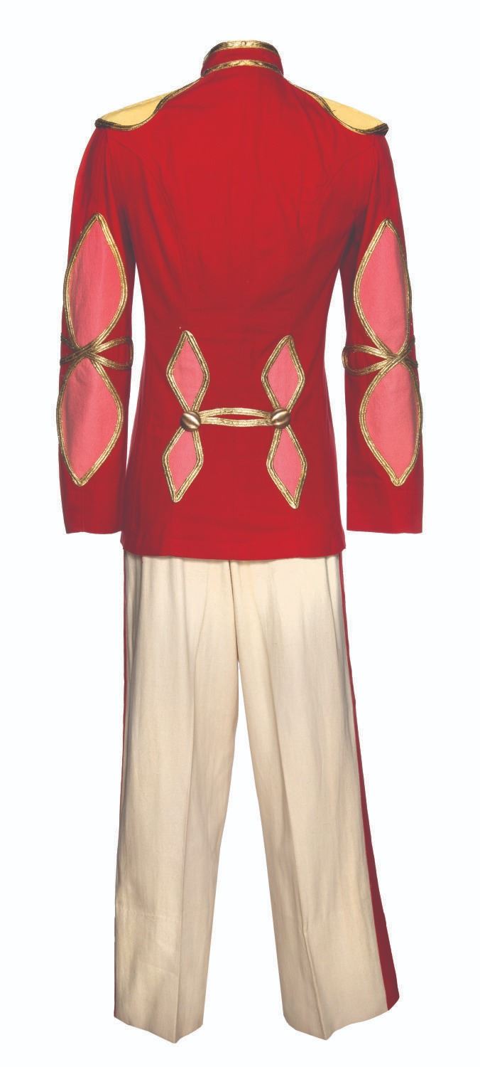 (Warner Brothers, 1962) A screen used marching band uniform from"The Music Man." The uniform can be seen during the film's finale as the band marches to the tune of"Seventy Six Trombones." The distinctive uniforms with gold braid, pink oval decorations, and gold buttons are worn by dozens of performers in the final number. The jacket and pants both have labels dating their manufacture to March of 1961, predating the film's production. The jacket is marked inside as size"6", and the pants as simply a size 28, with the length likely hemmed exactly to the actor who wore them. Both jacket and pants are in very good condition, with wear from age, and some color shift of white fabrics to off-white.