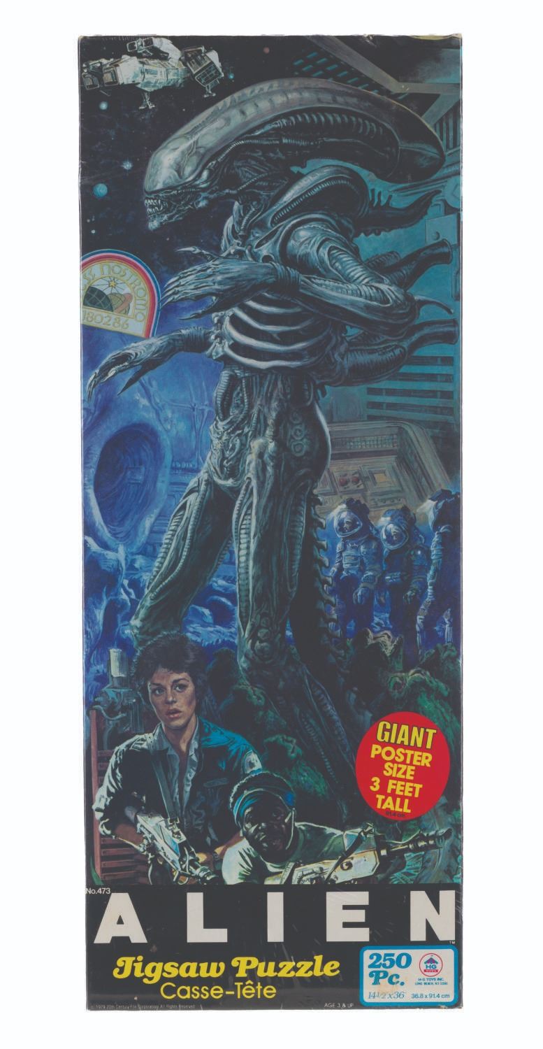 (H-G Toys Inc., 1979) A rare sealed giant poster-size "Alien" jigsaw puzzle featuring artwork by Earl Norem. The 250-piece puzzle measures 14.5" and stands 3 feet tall when completed. Sealed in its original 7.5" x 1.5" x 19" box, the puzzle is in fine condition, while the box exhibits light wear, several tears in the plastic, and a small stain at the bottom-right corner.