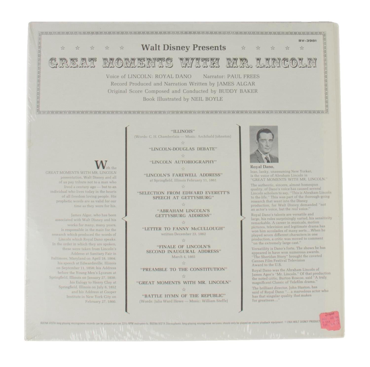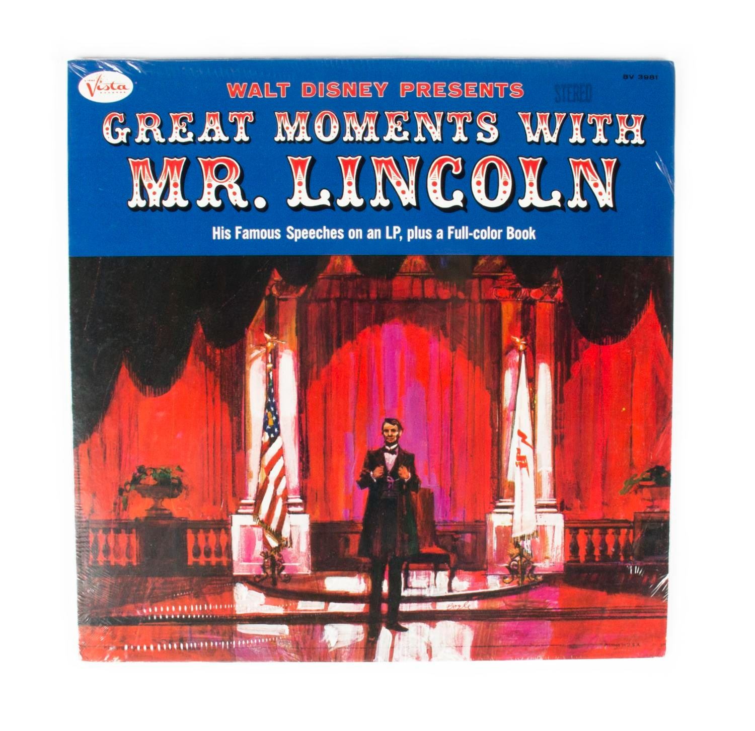 (Disneyland, 1964) An extremely rare unopened Walt Disney Presents Great Moments with Mr. Lincoln record featuring several of Lincoln's speeches and a full-color book. The record was created for the World's Fair version of the attraction, as it would not come to Disneyland until 1965. However, this particular unopened record was sold at Disneyland and still retains its original Disneyland sales sticker on the reverse. Measuring 12.5" x 12.5", this record is in fine condition with minor edge wear.