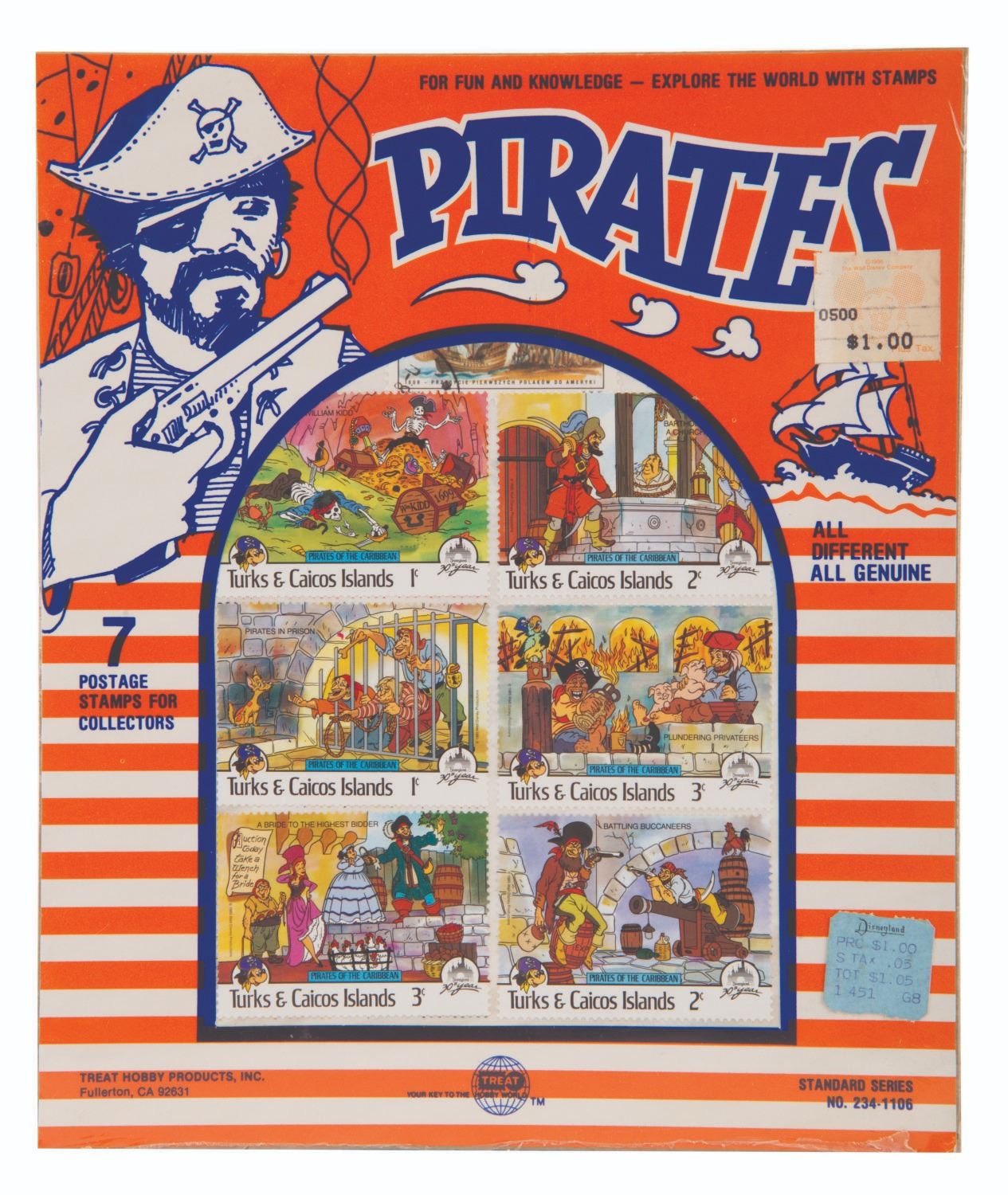 (Disney, 1985) A sealed set of 6 Pirates of the Caribbean-themed stamps issued in the Turks and Caicos Islands. Also included in the set is a single non-Disney cancelled stamp. The set measuring 6.5” x 7.75” is in fine condition.