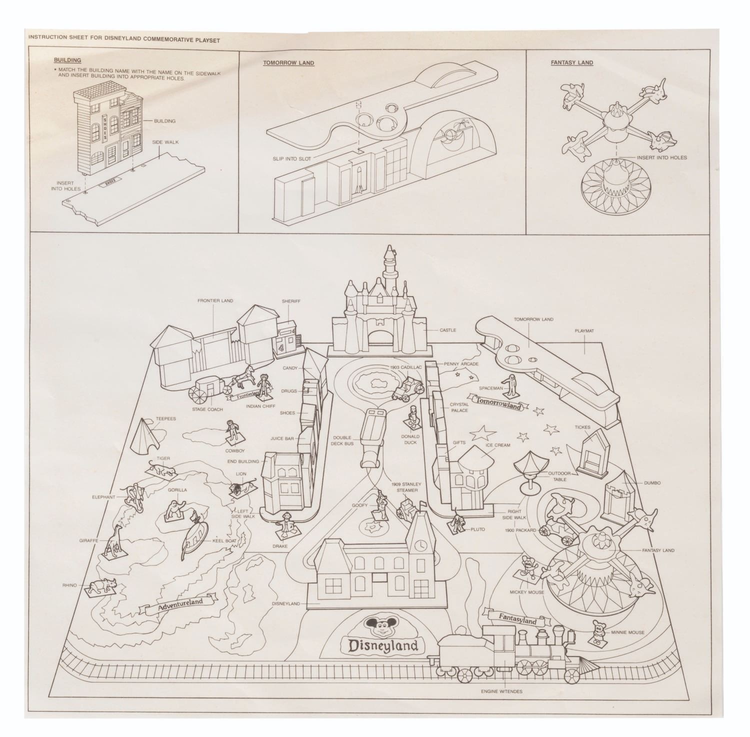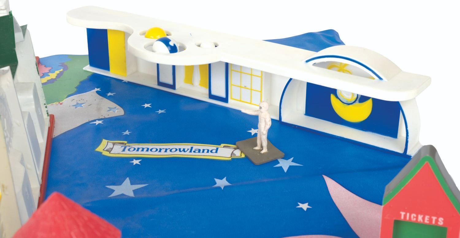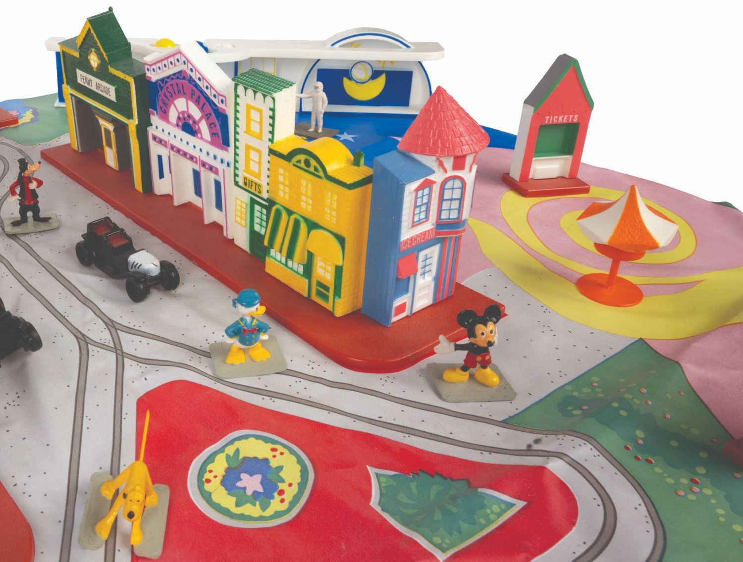 (Disneyland/Sears, 1988) A Vintage Sears Disney Magic Commemorative Playset. This playset comes complete with all the pieces, vehicles, figures, and playmat in its original box. The pieces are in fine condition and the 20”x13”x2.5” box is in good condition with creases, and wear to its surfaces, edges, and corners.