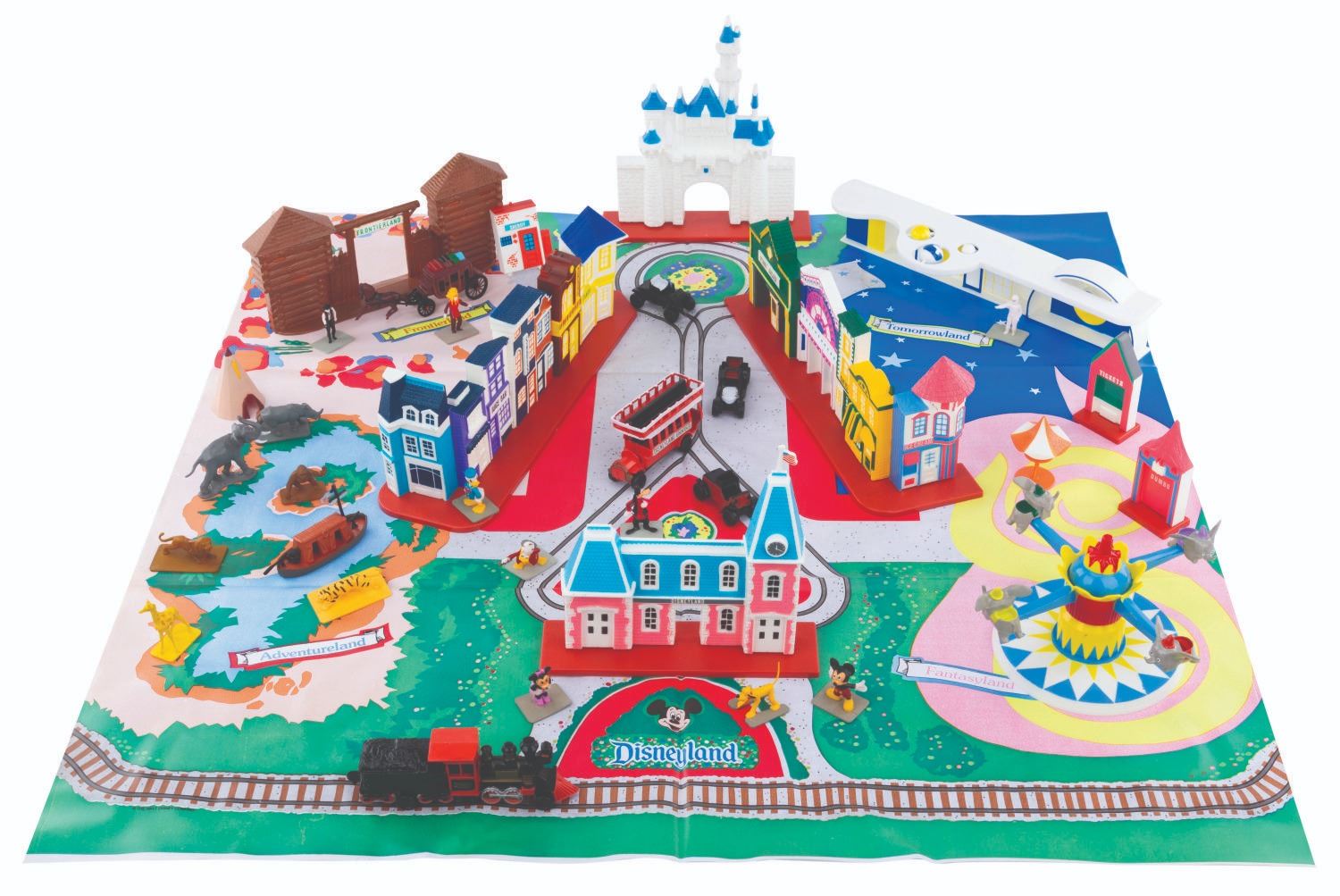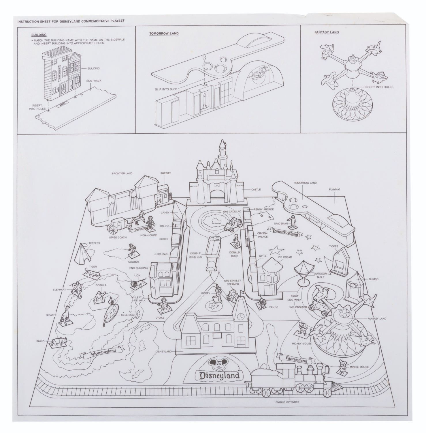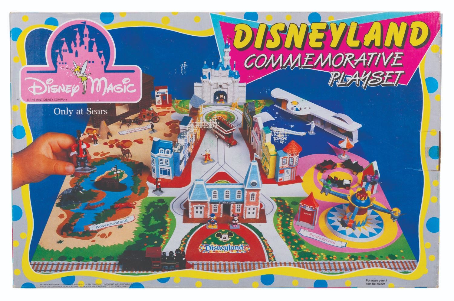 (Sears, 1980s) A Disneyland playset sold exclusively at Sears. The set is a colorful plastic recreation of Disneyland and its iconic lands. Figures include the Fab Five, Ludwig Von Drake, and land-specific characters, including jungle animals, a cowboy, and an astronaut. The set in the original box measuring 13” x 20” x 2.5” is in very good condition, near-complete with only the base of the sheriff's office missing, and some soft plastic figures feeling slightly tacky from age.