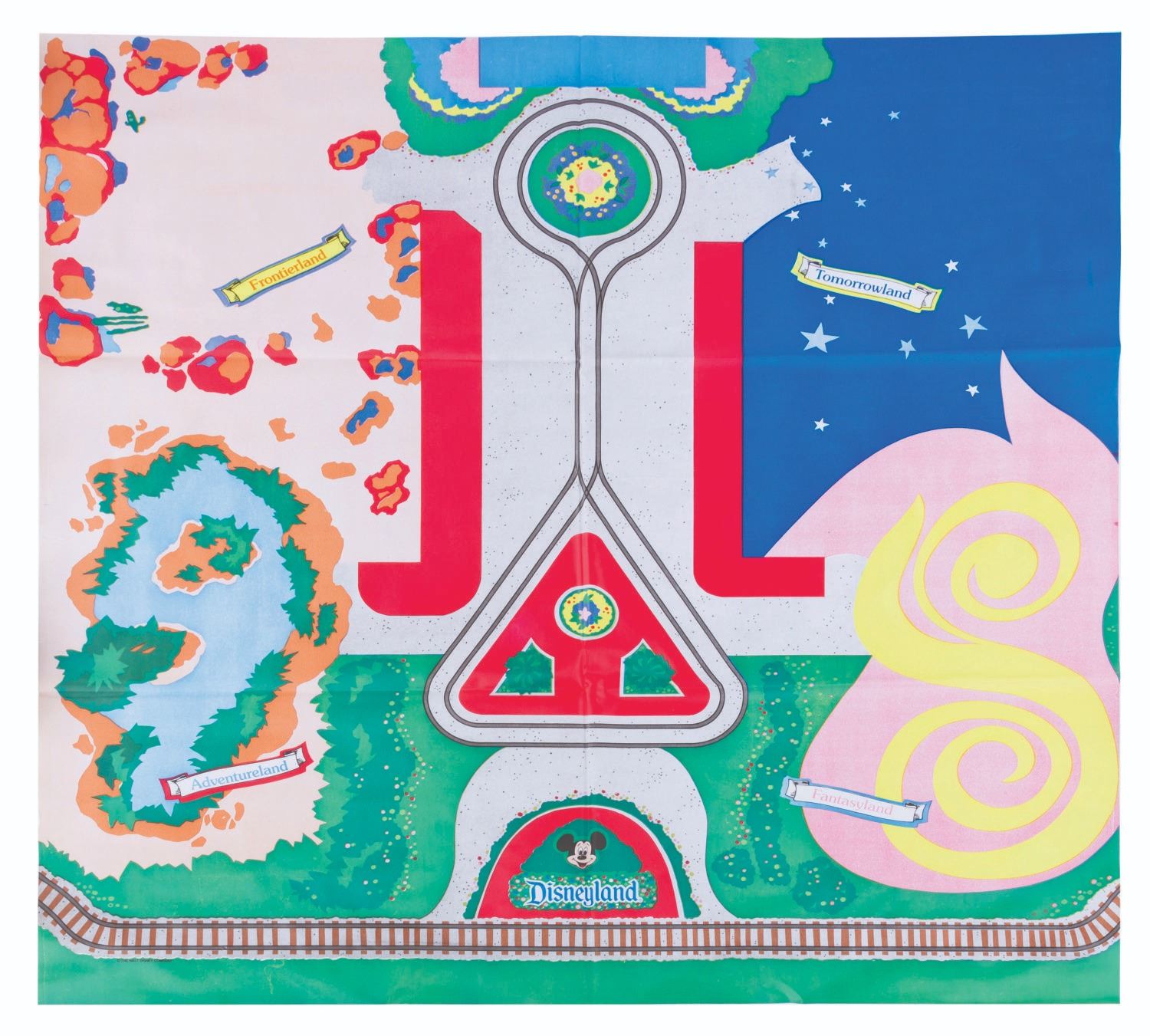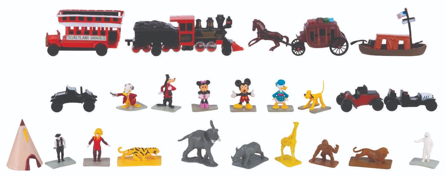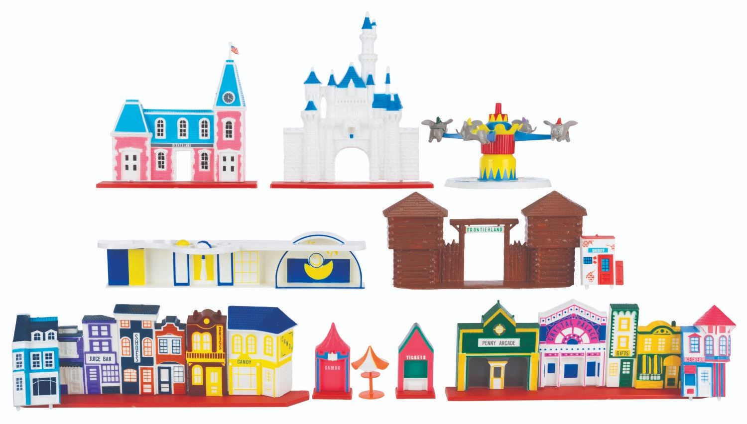 (Sears, 1980s) A Disneyland playset sold exclusively at Sears. The set is a colorful plastic recreation of Disneyland and its iconic lands. Figures include the Fab Five, Ludwig Von Drake, and land-specific characters, including jungle animals, a cowboy, and an astronaut. The set in the original box measuring 13” x 20” x 2.5” is in very good condition, near-complete with only the base of the sheriff's office missing, and some soft plastic figures feeling slightly tacky from age.