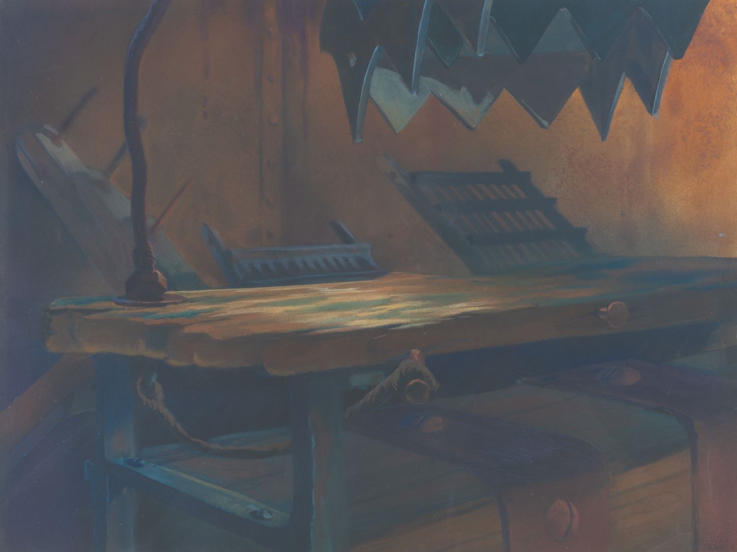 (MGM/United Artists, 1982) An original production background from “The Secret of NIMH” directed by Don Bluth. Accomplished in gouache on thick paper, this background appears when Mrs. Brisby visits Mr. Ages at the beginning of the film. Measuring 10.5” x 13.5”, the background is in very good production-used condition with corner pinholes, light wear and discoloration to the edges, and a 0.75” x 1” area of discoloration from tape on the reverse.