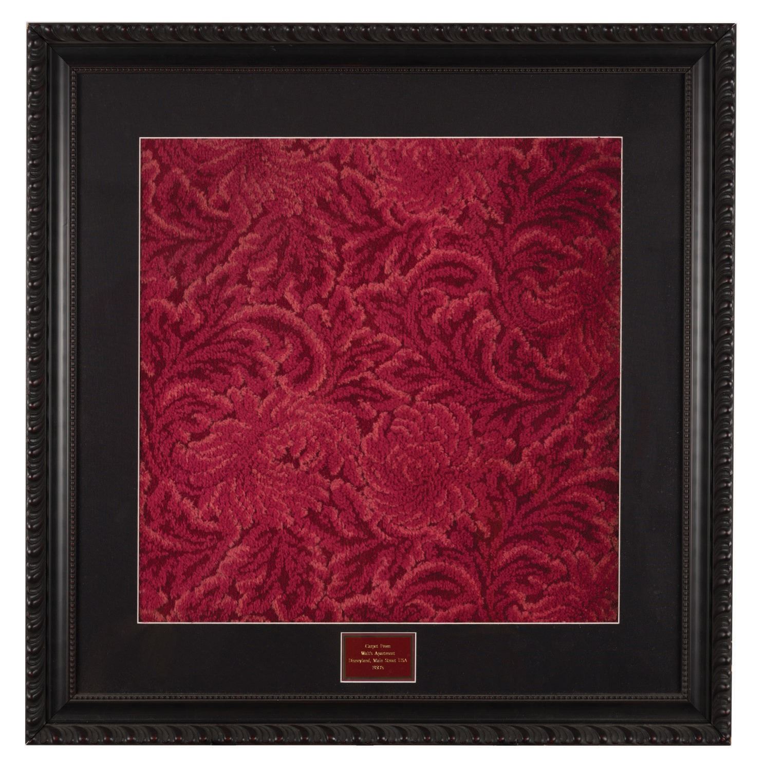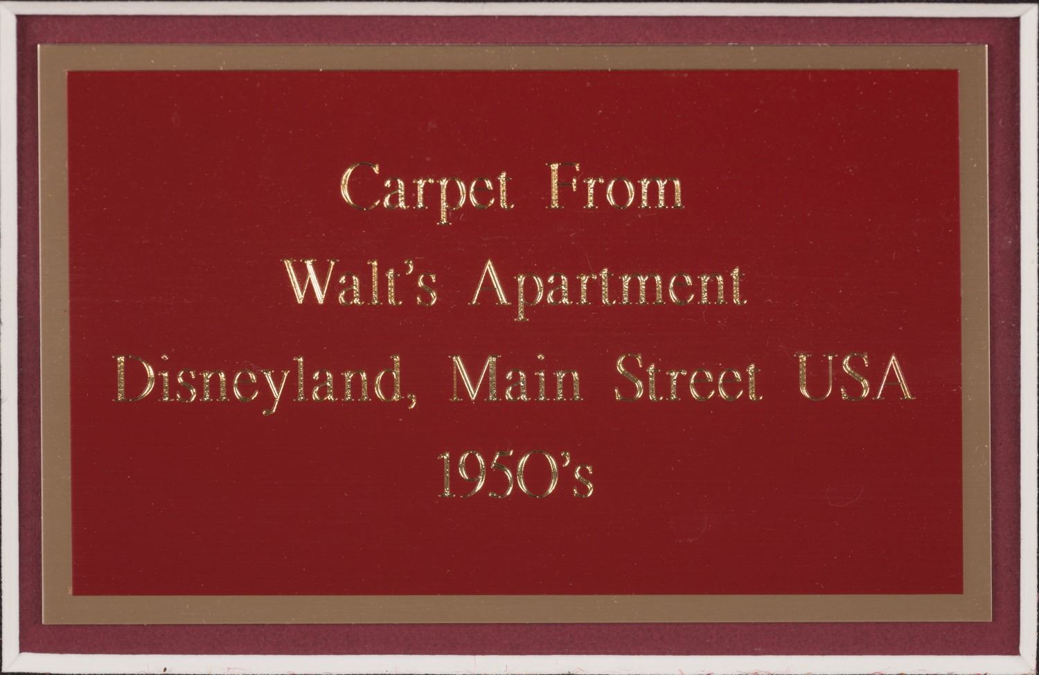 (Disneyland, 1950s-70s) A large segment of carpet from Walt Disney's Firehouse Apartment at Disneyland. Above the Disneyland Fire Department was a 500 square-foot apartment Walt Disney personally stayed in during construction, and entertained family and friends during the early years of Disneyland. The Victorian style apartment was designed by Imagineer Emile Kuri. This carpet was used in the apartment and removed during a rehabilitation. A total 27.5"x27.75" of the swatch is visible within the mat, displayed with a plaque inside a 41"x40.5" frame.