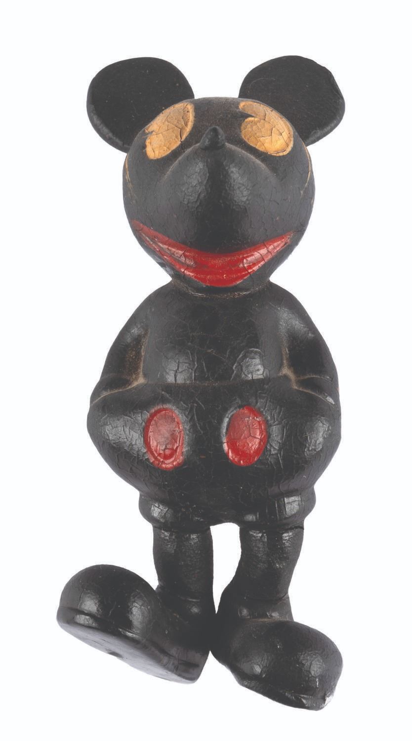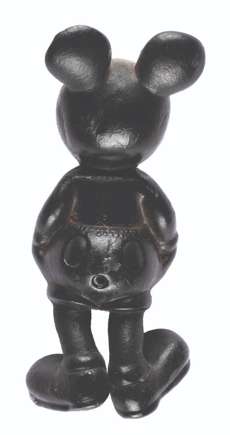 (Seiberling, 1930s-1940s) A rubber Mickey Mouse figure by Seiberling Latex Products Co. The hard black Mickey figure has a painted red mouth, red buttons, and white eyes. Measuring 3.5” tall, the figure is in good condition with cracking scratches, wear, scuffs, and paint wear.