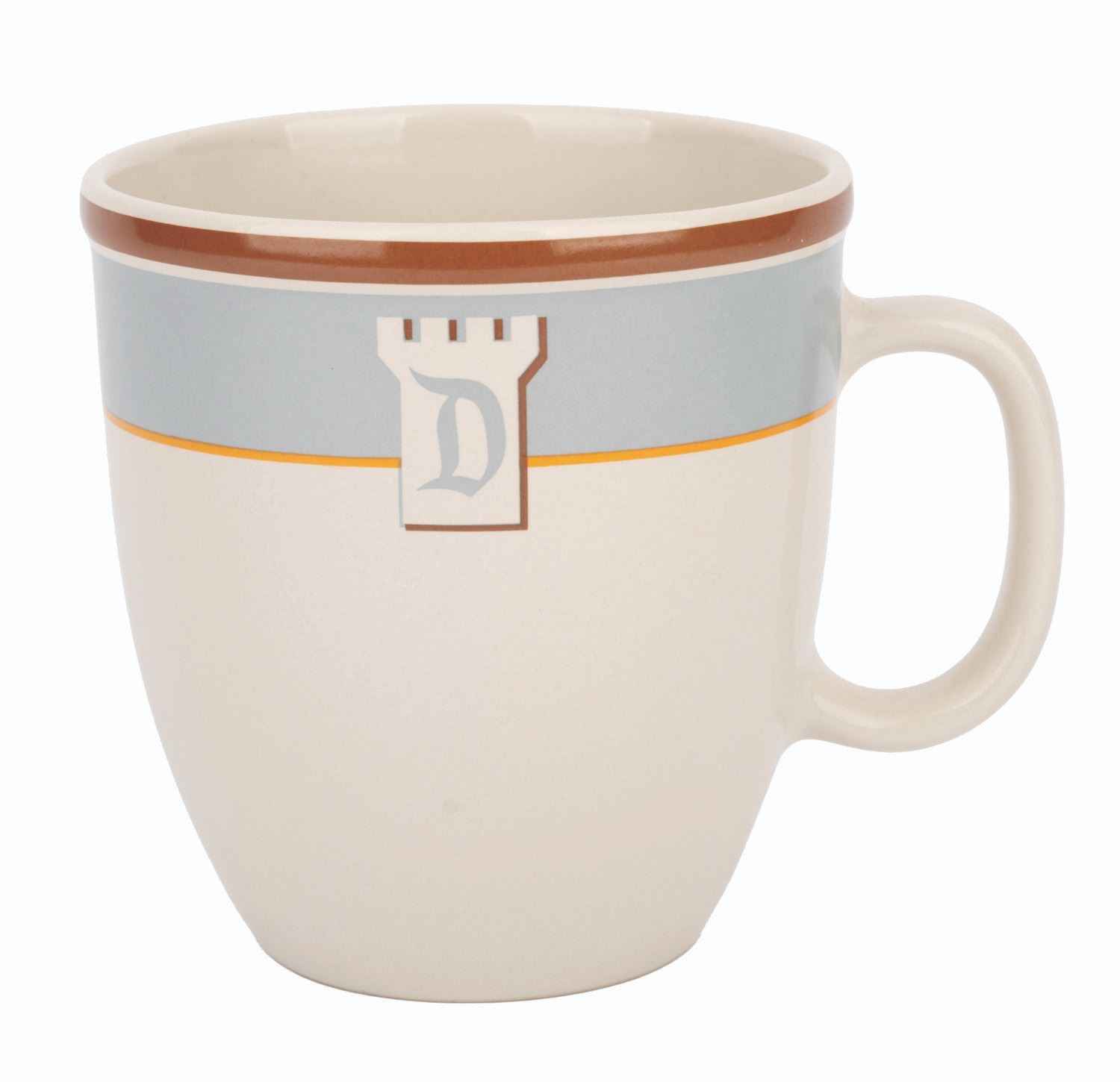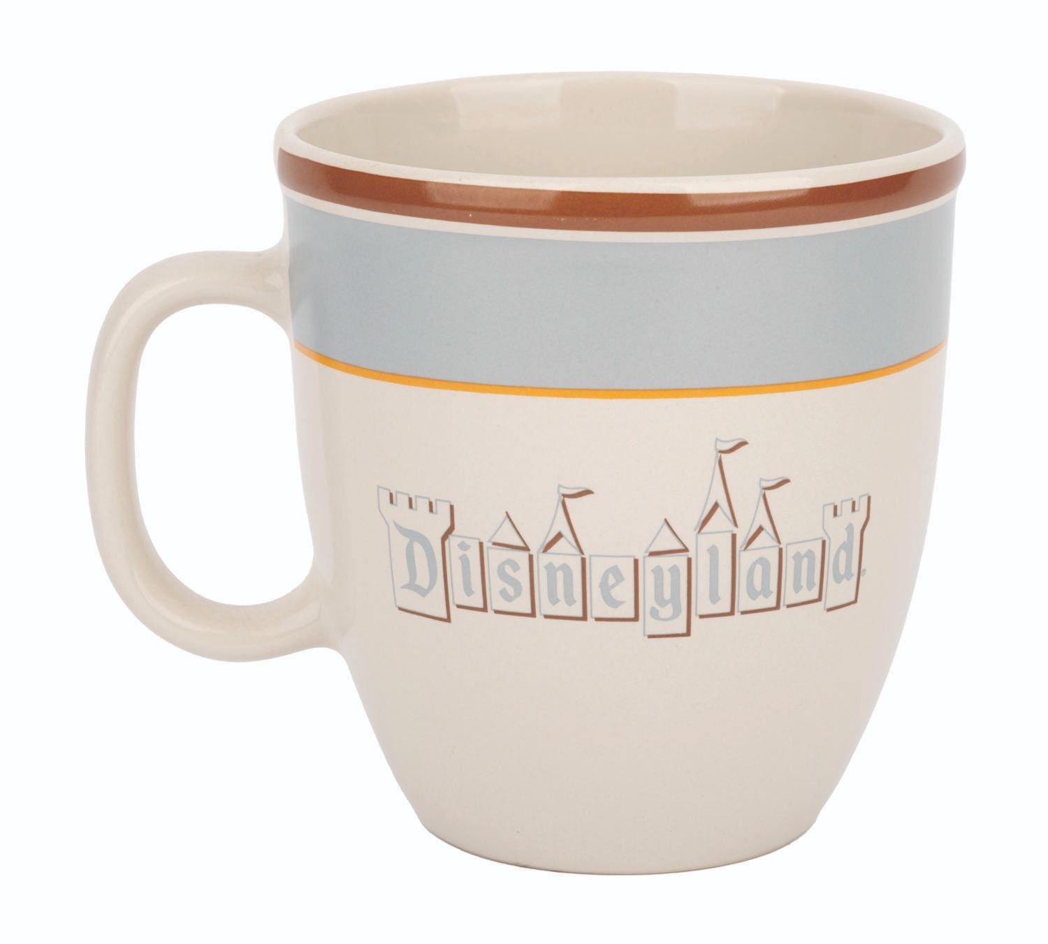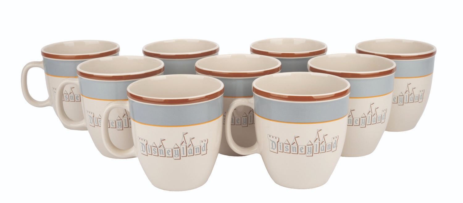 (Disneyland, 1980s-90s) A set of nine Disneyland Coffee Mugs. This vintage set of mugs is decorated with a two-color Disneyland marquee. Measuring 4.5" tall and 5.5" in diameter, these cups are in very good condition with minor wear.