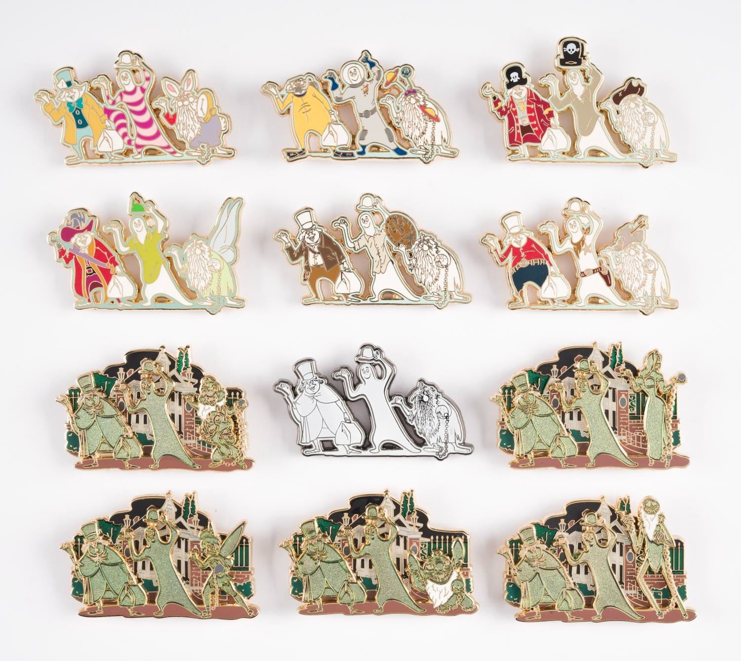 (WDI, 2009) A Collection of (12) Rare WDI Exclusive Hitchhiking Ghost Crossover Pins. This group includes (12) LE300 pins of the Hitchhiking Ghosts “crossing over” with various Disney Parks characters, lands, and attractions like Jessica Rabbit, Pirates of the Caribbean, and Peter Pan’s Fight. Among this lot is the complete 2009 series set. Each collectible is in fine condition.