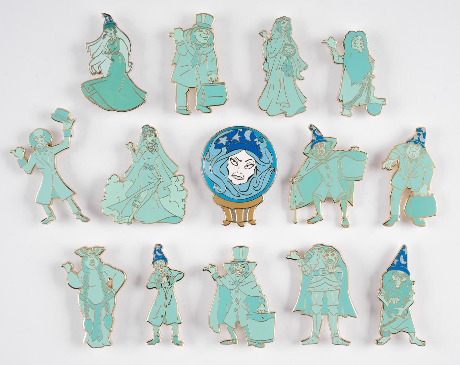 (WDI) A Walt Disney Imagineer Exclusive Ghosts Pin Set. Among this lot are LE300 ghost pins, and LE250 Characters Sorcerers Series pins of ghosts wearing sorcerer hats. Each pin is in fine condition.