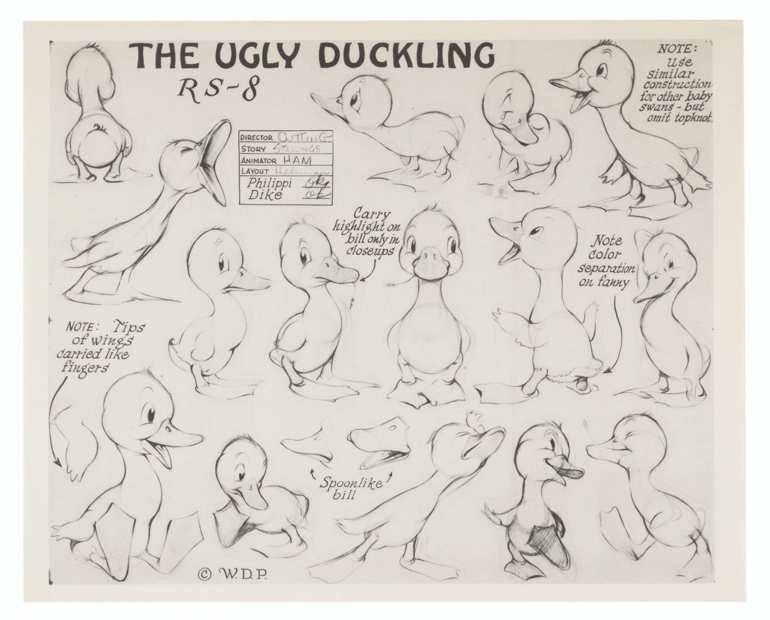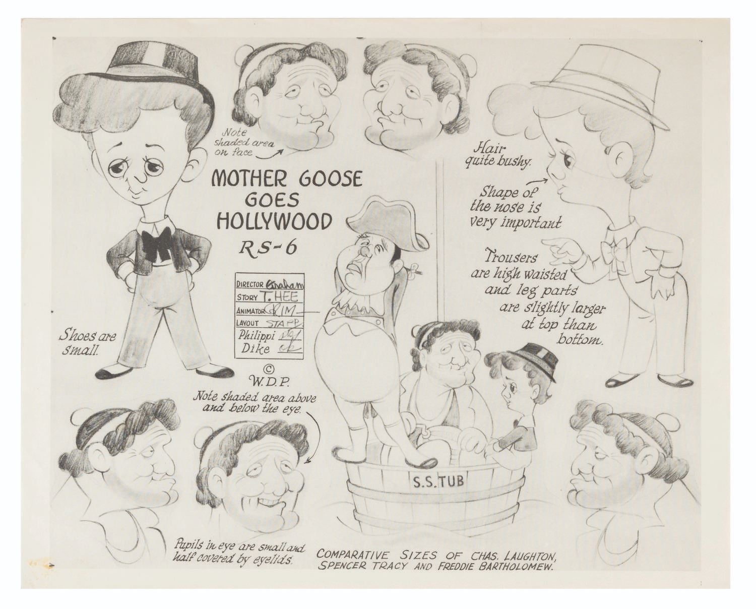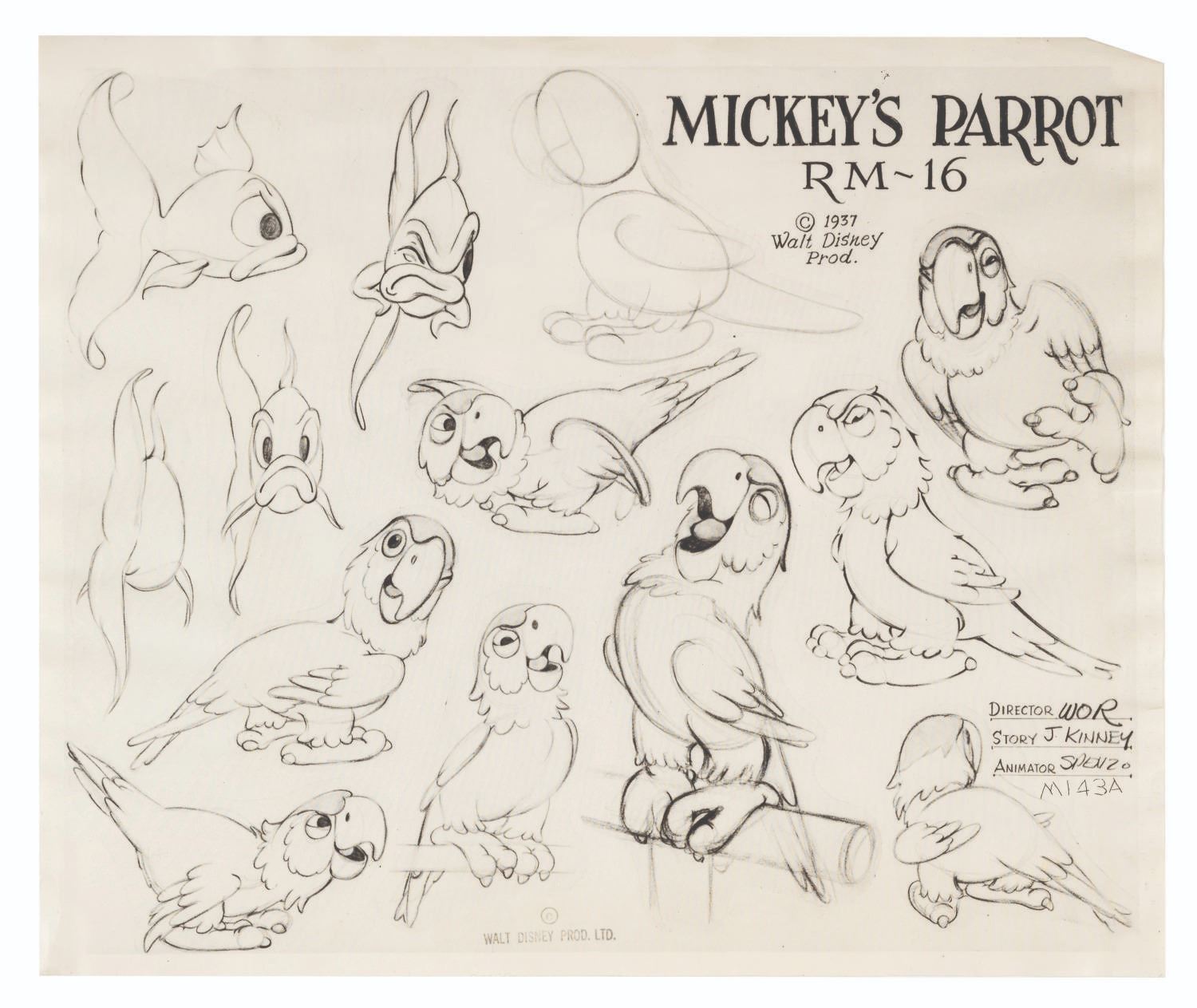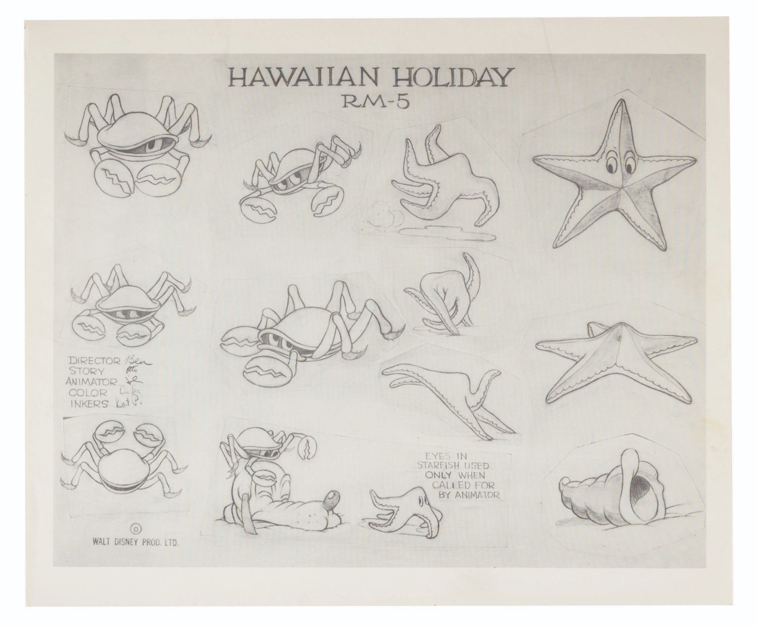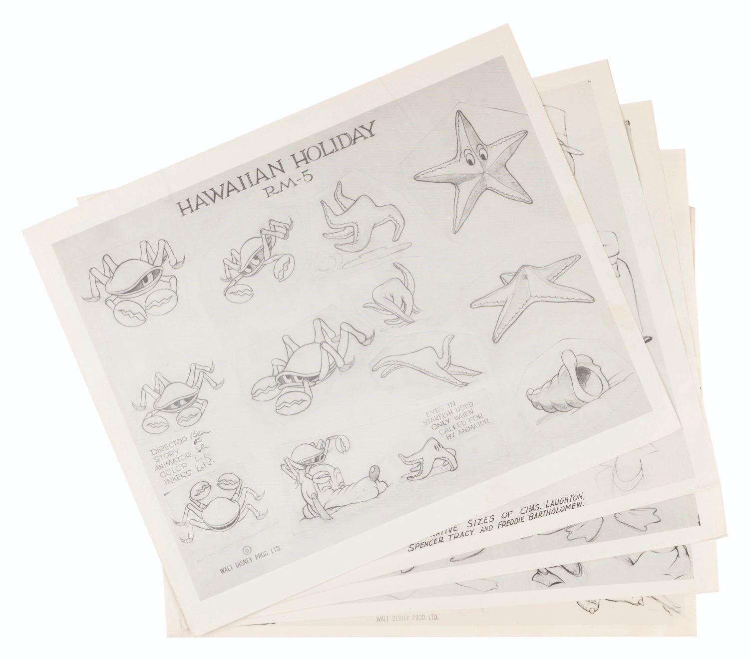 (Disney, 1937-39) A collection of five model sheets from Disney animated sorts released from 1937 to 1939. Included are one sheet each from “Hawaiian Holiday,” “Mickey’s Parrot,” and “Mother Goose Goes Hollywood.” Two model sheets are included from “The Ugly Duckling,” the very last Silly Symphony cartoon. Measuring from 10” x 12” to 10” x 12.5”, the sheets are overall in very good condition with light wear from handling and age. The “Mickey’s Parrot” sheet is on glossy, heavier paper than the others, in good condition with waviness and slight creasing to the left and right sides.