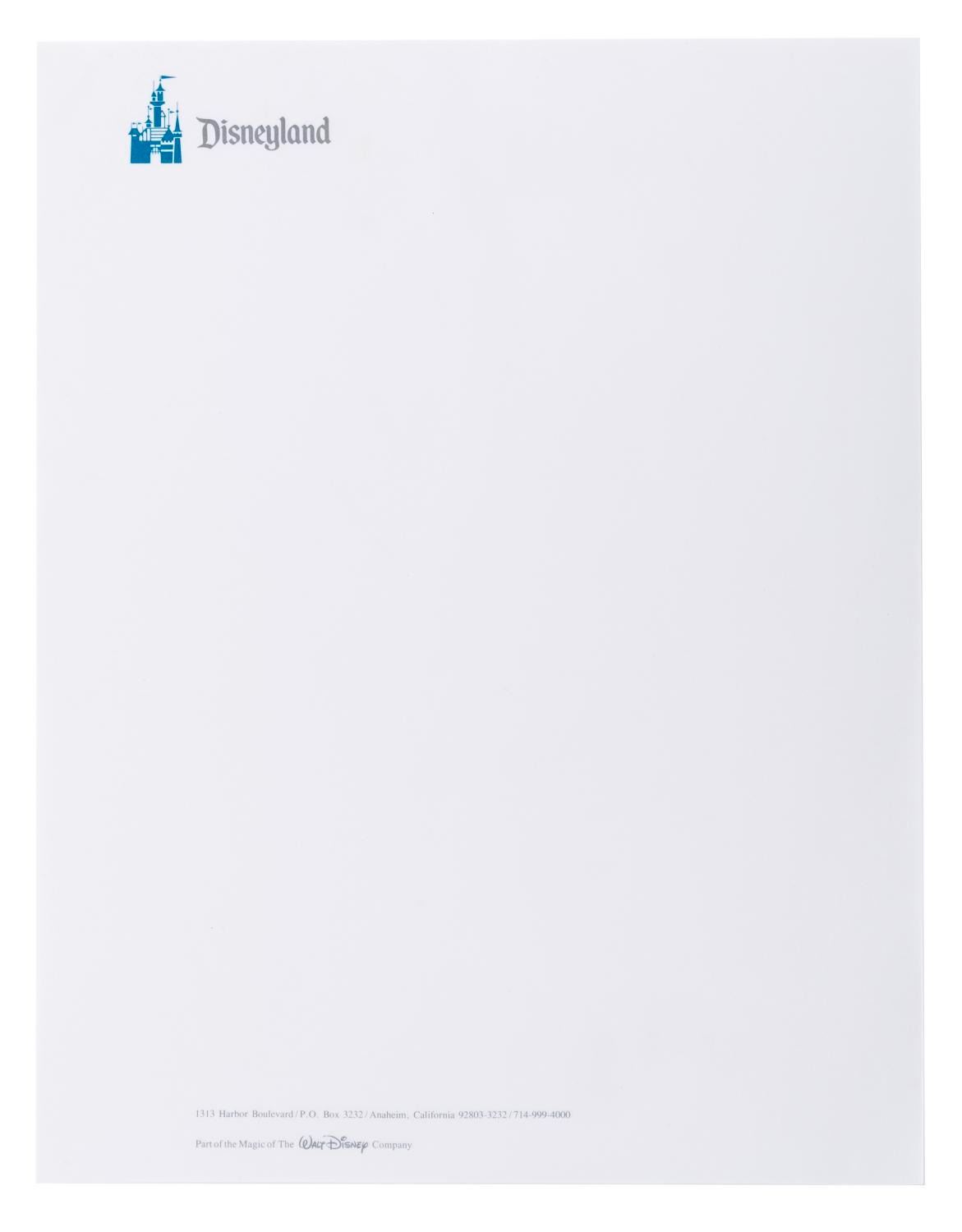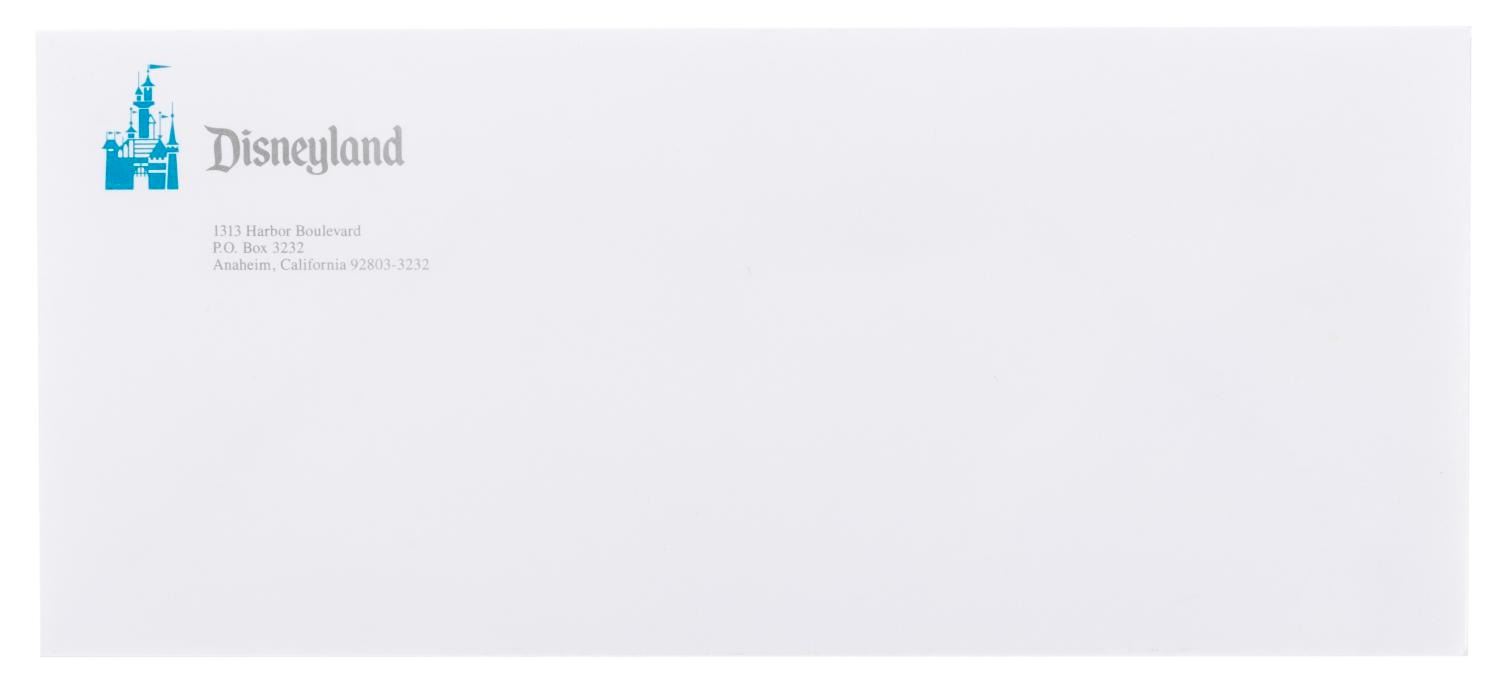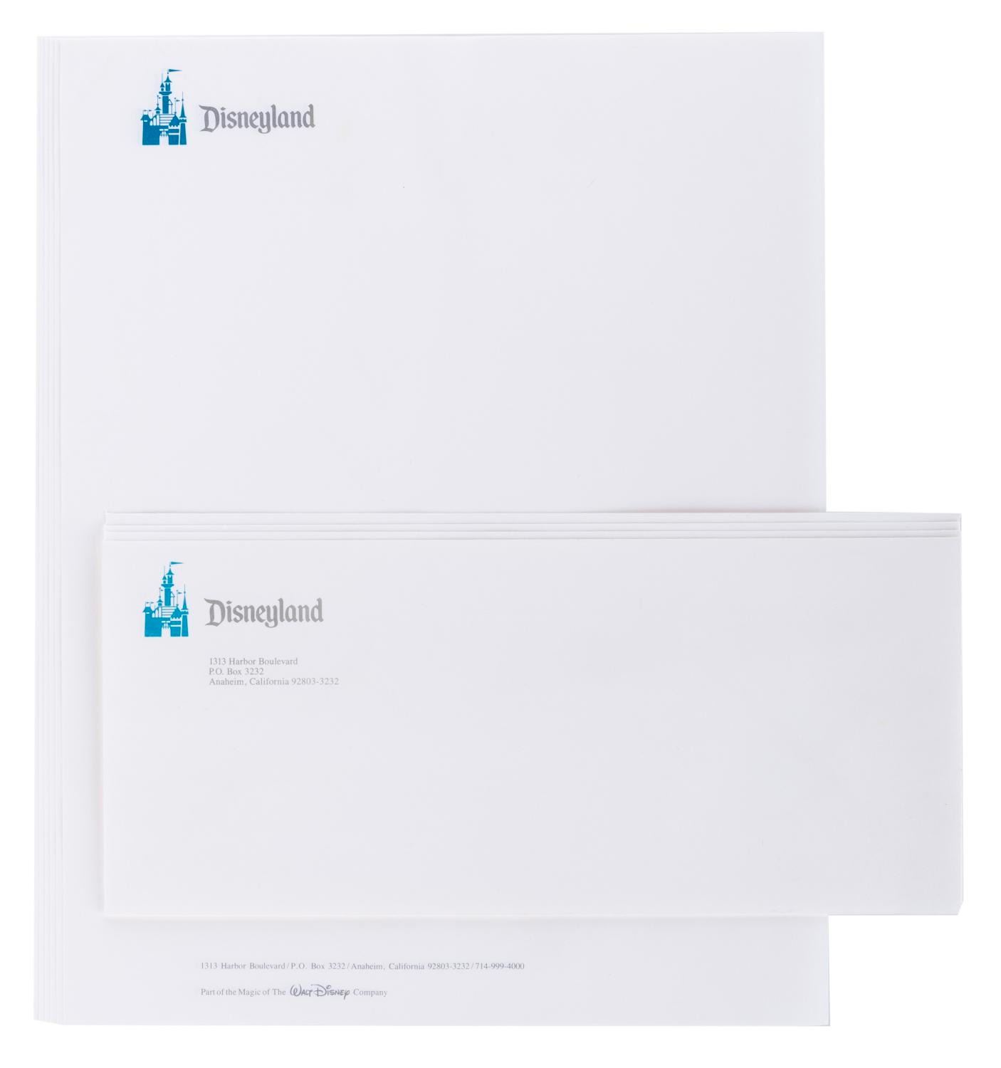 (Disneyland,1980s-90s ) Six sheets of Disneyland stationery featuring a vibrant Sleeping Beauty Castle logo, with four matching envelopes. Measuring 8.5" x 11" and 4.25" x 9.5", the stationery is in fine condition, with slight waviness. Also included is a non-branded good condition 10" x 13" interoffice mail envelope that was used at the Park.
