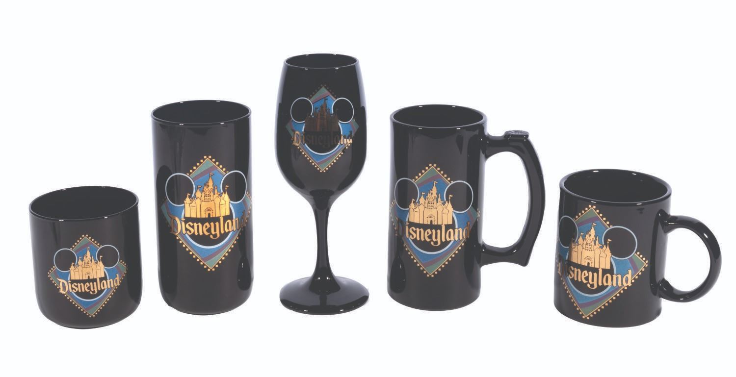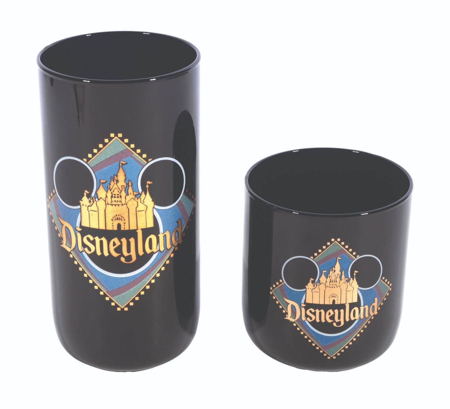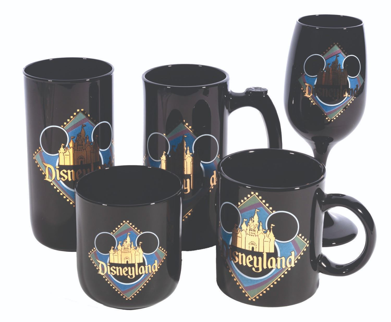 (Disneyland, 1990s) A set of glasses and mugs featuring Sleeping Beauty Castle and a Mickey Mouse ear icon. Included are a 7.5" tall wine glass, a 5.75" highball glass, a 3.5" tall rocks glass, a 5.5" tall mug, and a 3.75" tall mug. All items are in very good condition with light scratches.