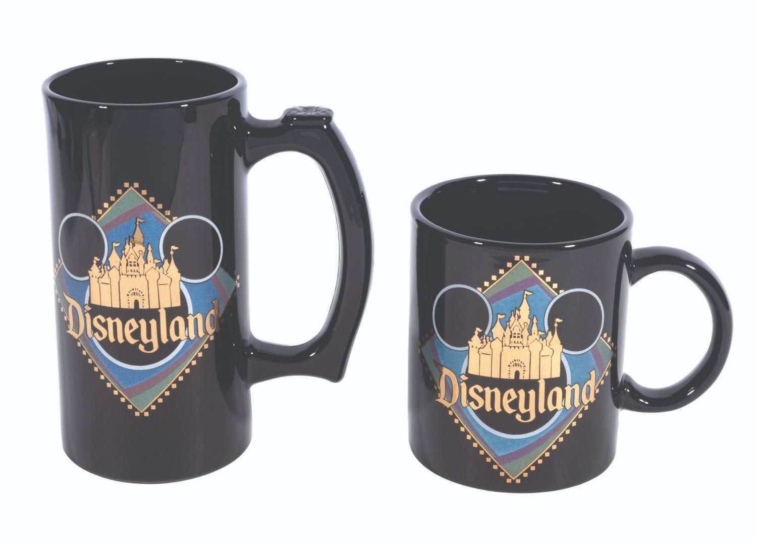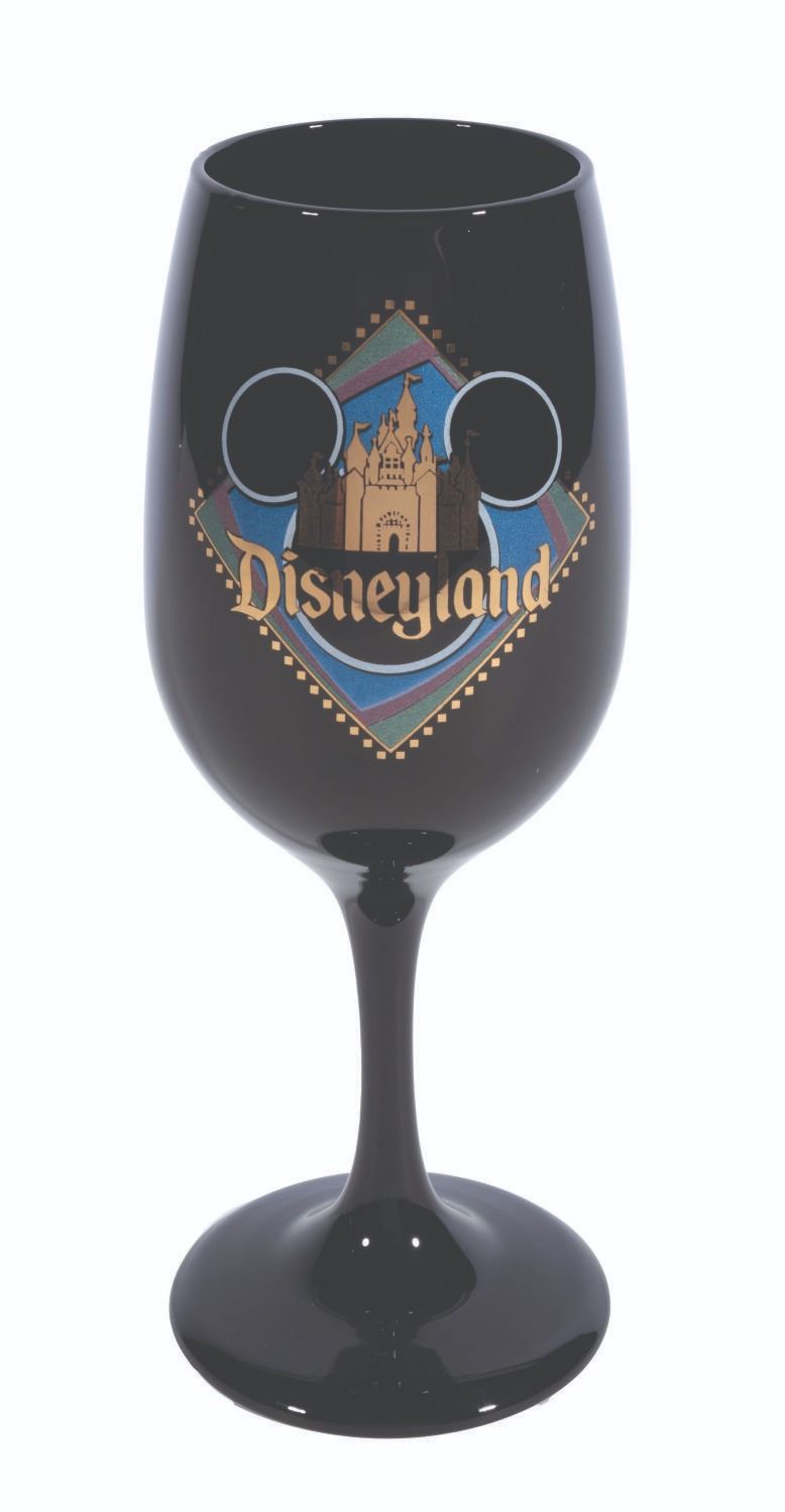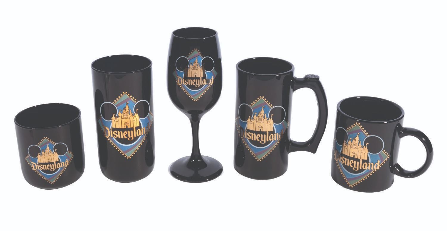 (Disneyland, 1990s) A set of glasses and mugs featuring Sleeping Beauty Castle and a Mickey Mouse ear icon. Included are a 7.5" tall wine glass, a 5.75" highball glass, a 3.5" tall rocks glass, a 5.5" tall mug, and a 3.75" tall mug. All items are in very good condition with light scratches.