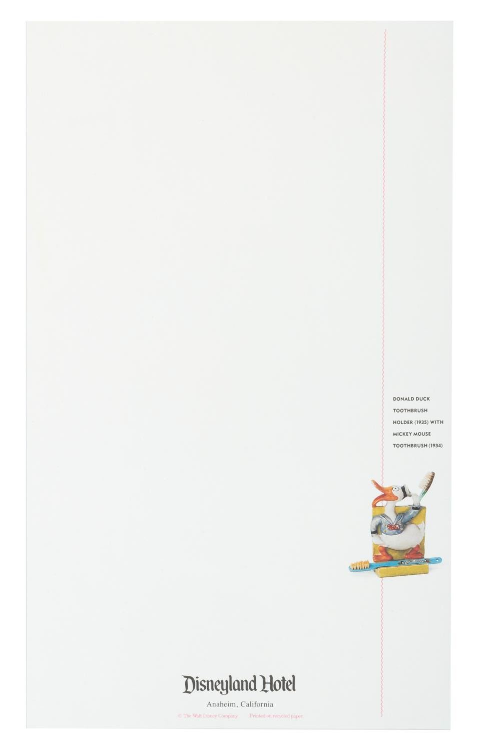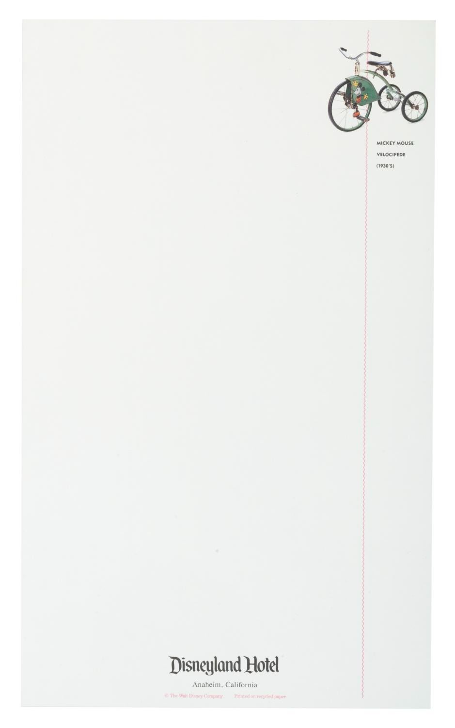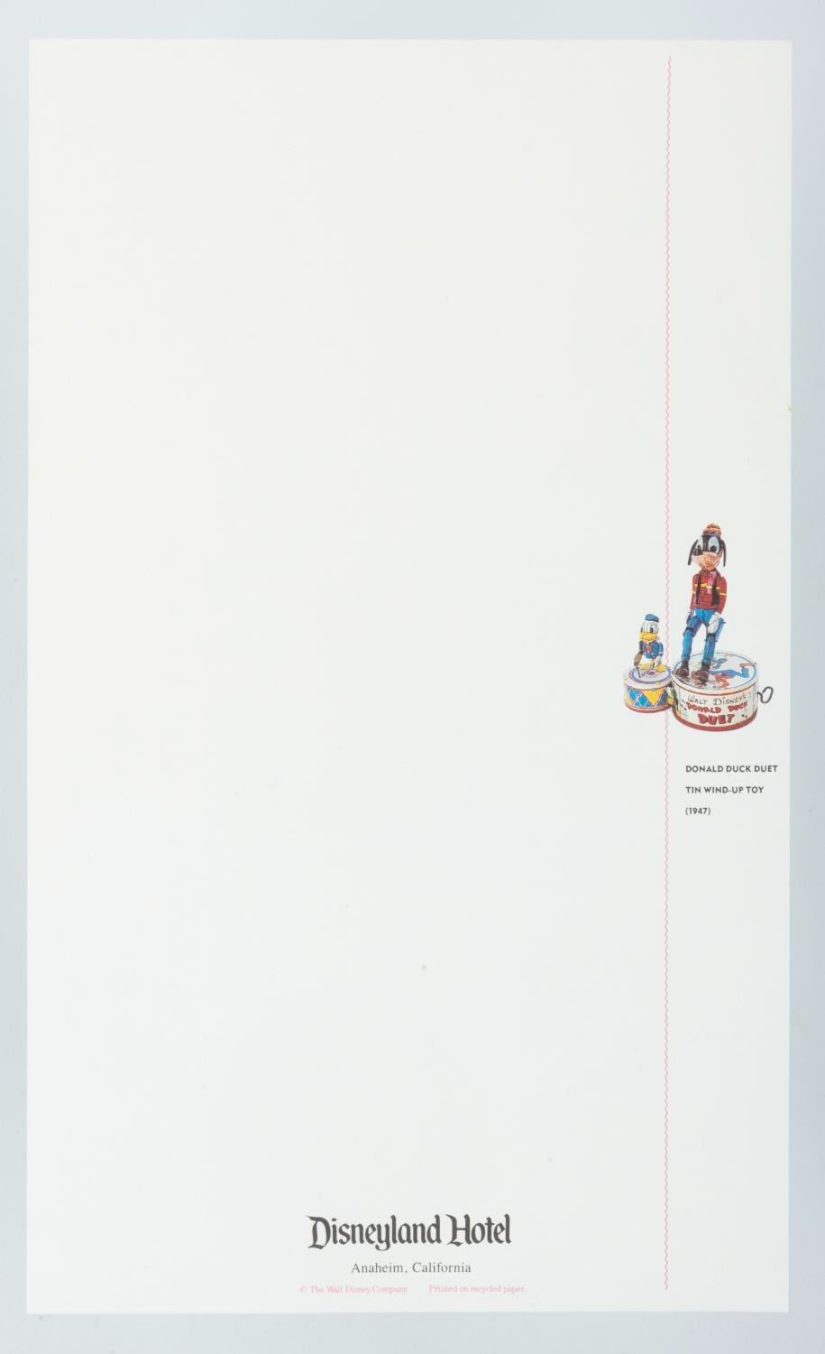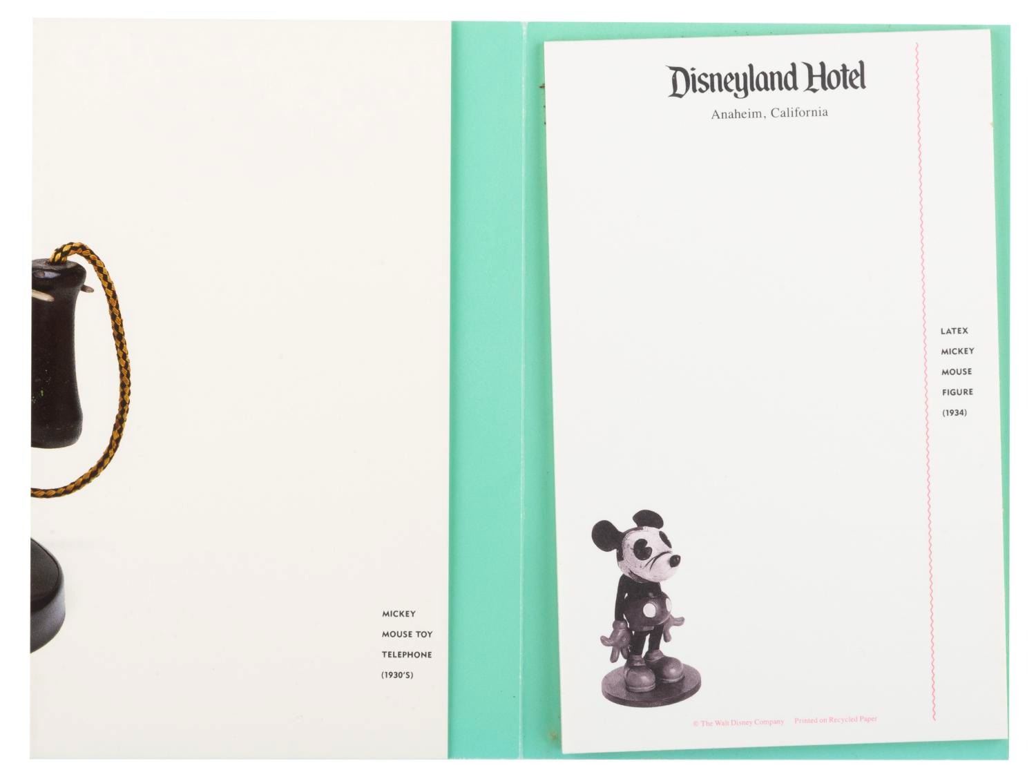 (Disneyland, 1990s) A collection of two notepads, two envelopes, and three sheets of paper, all with images of classic Disney toys. Measuring up to the 6” x 10” paper, the stationery is in very good condition, with small creases to the corner of one envelope, one sheet of paper, and the edge of one notepad cover.