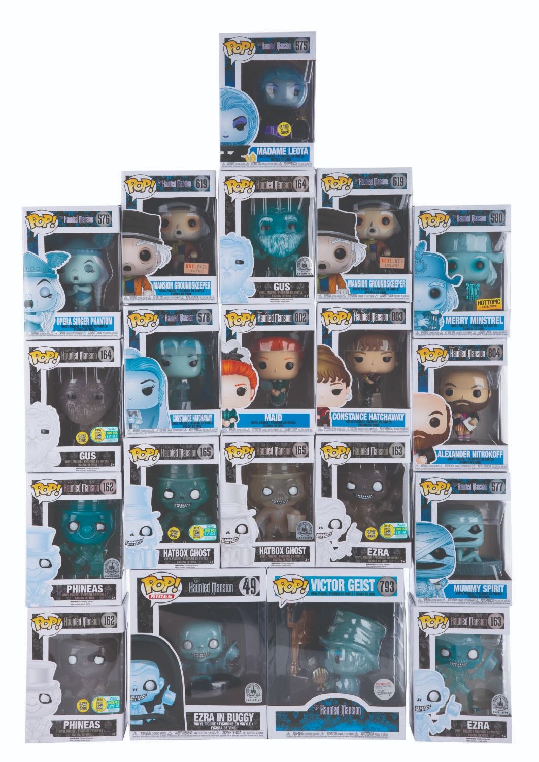 (Funko, 2010s) A set of (20) Funko/POP! Haunted Mansion Figures. Among this large collection are Hot Topics Exclusives, BOX LUNCH Exclusives, Disney Parks Exclusives, and 2016 ComicCon Exclusives: Ezra in Buggy (49), (2) versions of Phineas (162), (2) versions of Ezra (163), (2) versions of Gus (164), (2) versions of Glow-In-The-Dark Hatbox Ghost (165), Glow-In-The-Dark Madame Leota (575), Opera Singer Phantom (576), Mummy Spirit (577), Constance Hatchaway (578), Merry Minstrel (580), (2) Mansion Groundskeeper (619), Victor Geist (793), Maid (802), Constance Hatchaway (803), Alexander Nitrokoff (804). Each vinyl figure is in a fine condition and in its original box.