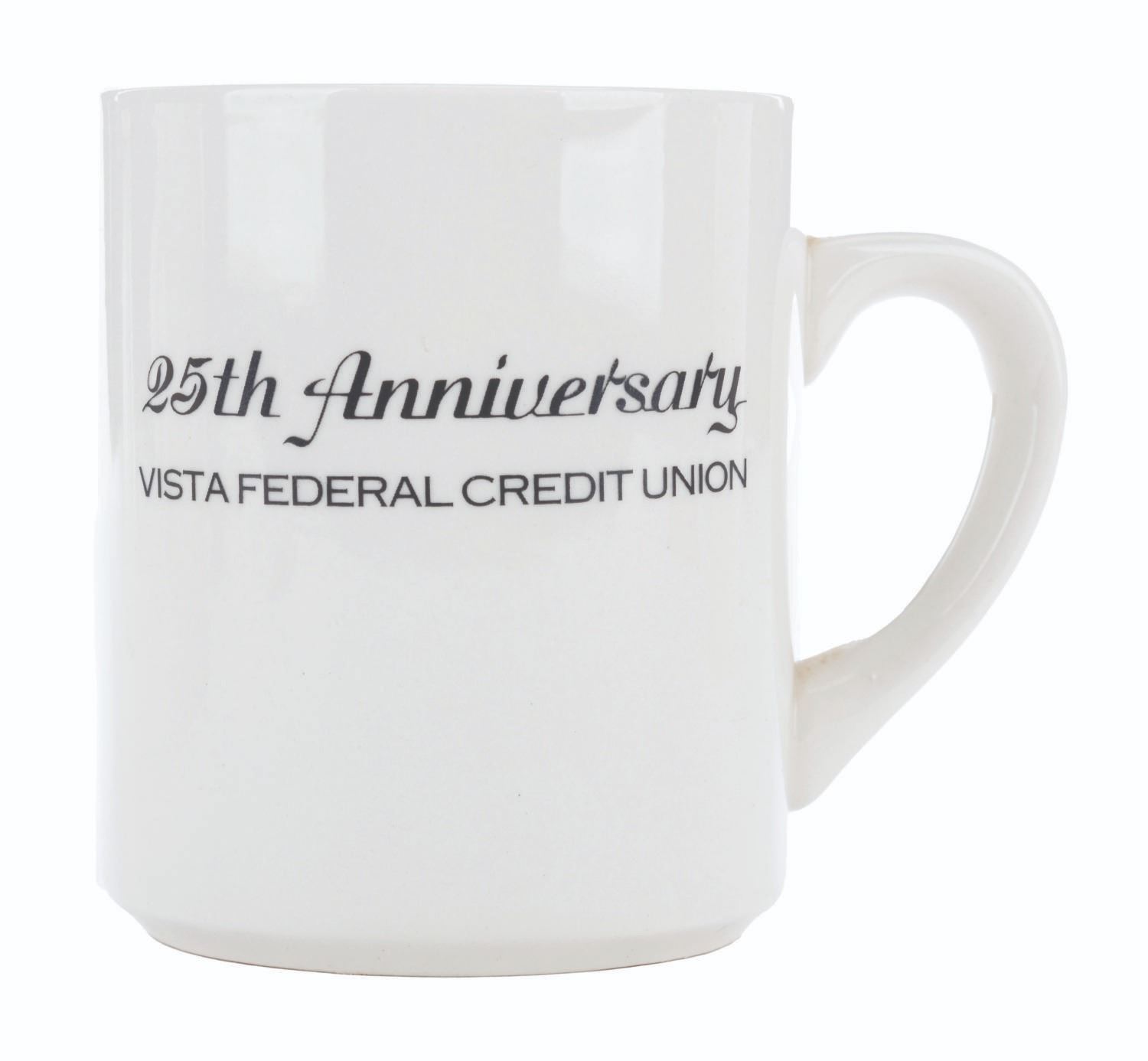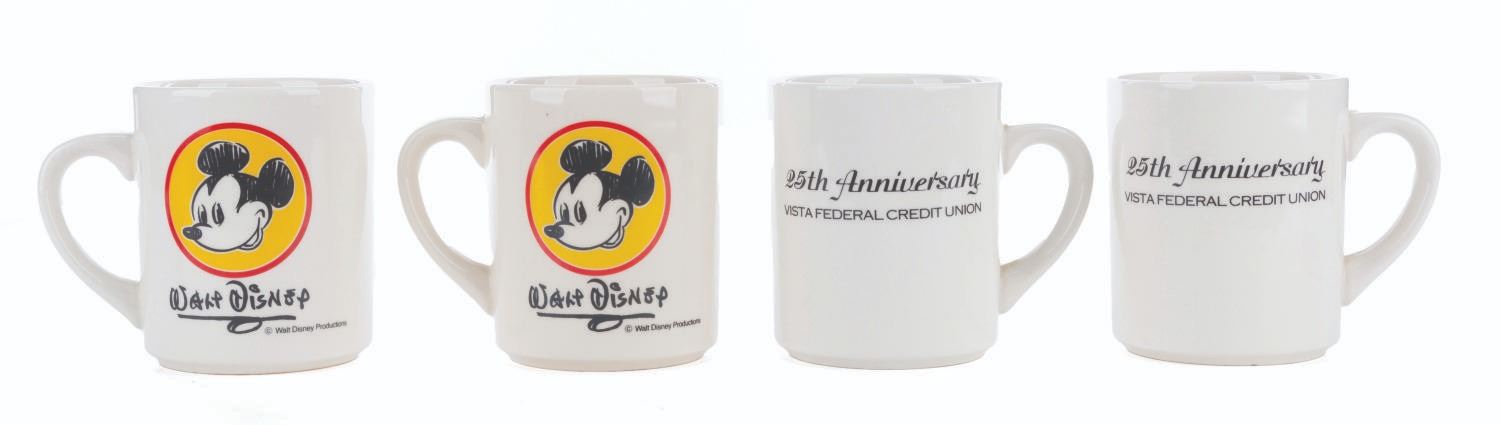 (Disney, 1985) A set of four coffee mugs created for the 25th anniversary of Disney's Vista Federal Credit Union. The 4" tall mugs feature a drawing of Mickey Mouse made by Walt Disney in 1942. The mugs are in fine unused condition.