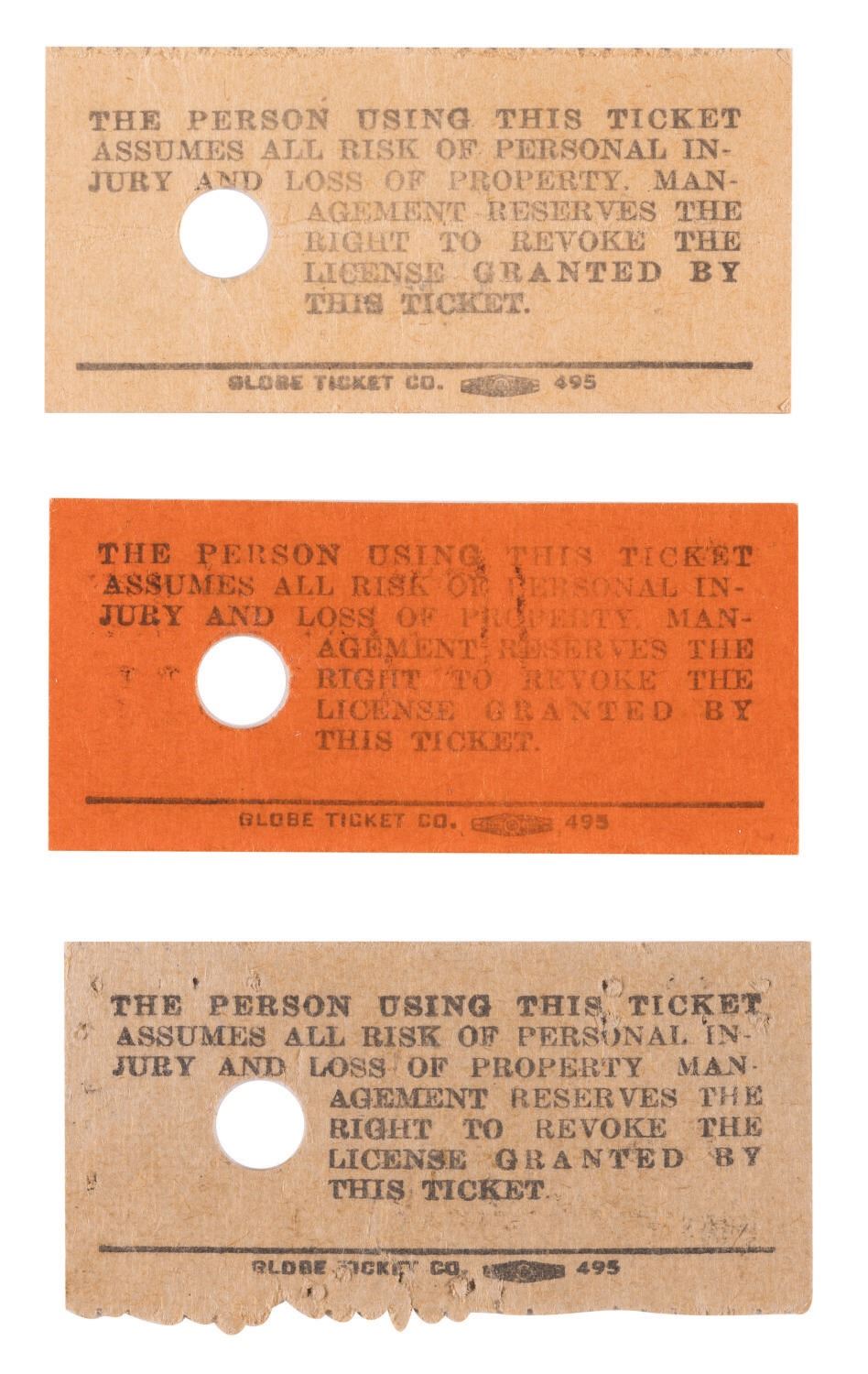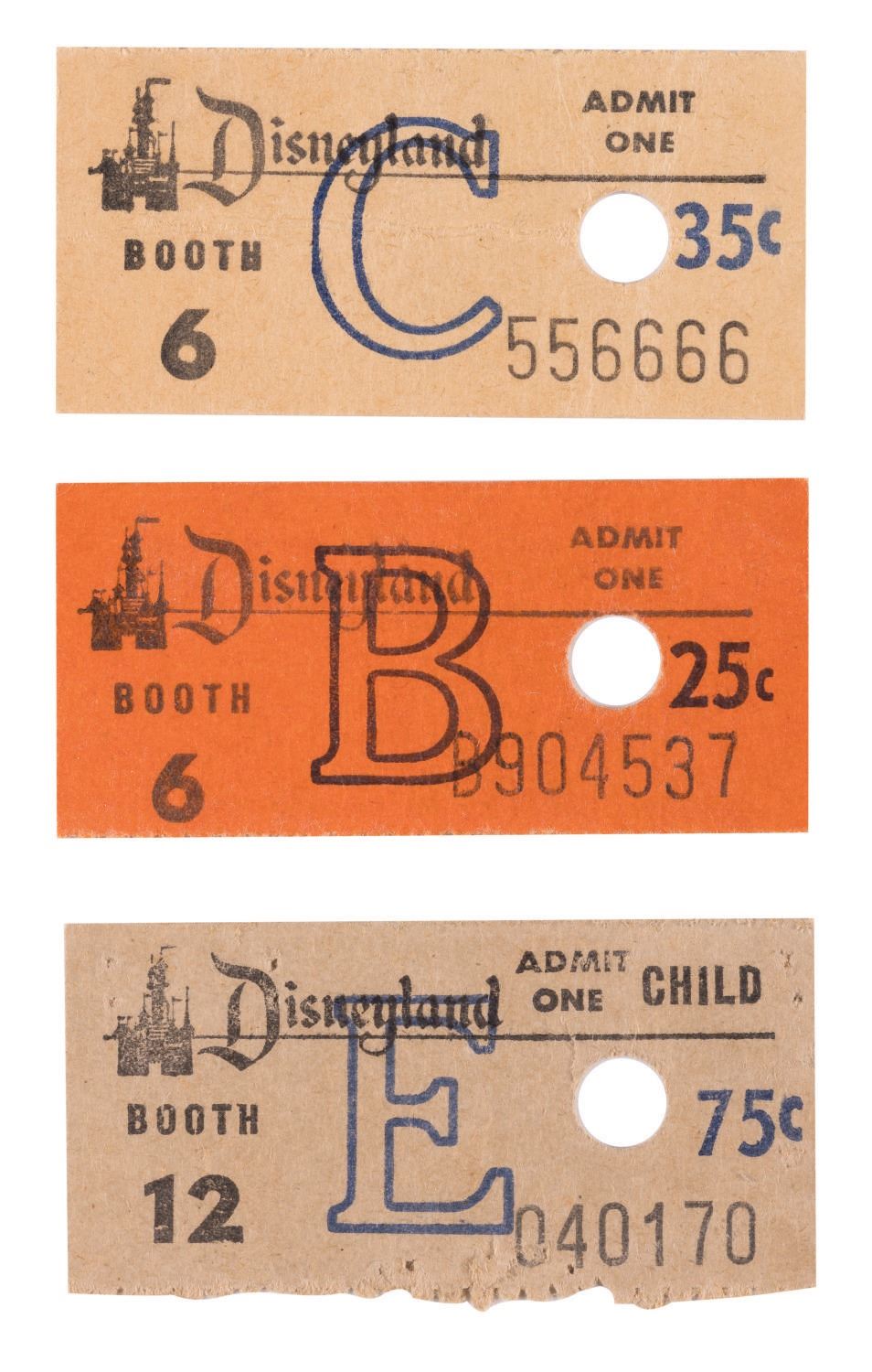 (Disneyland, 1960s) A set of (3) Disneyland Admission Tickets. Among the lot are a B (25 cent value), C (35 cent value), and E ticket (75 cent value). Measuring 2"x1", the tickets are in fine to good condition with a horizontal crease along the C ticket and minor wear.