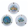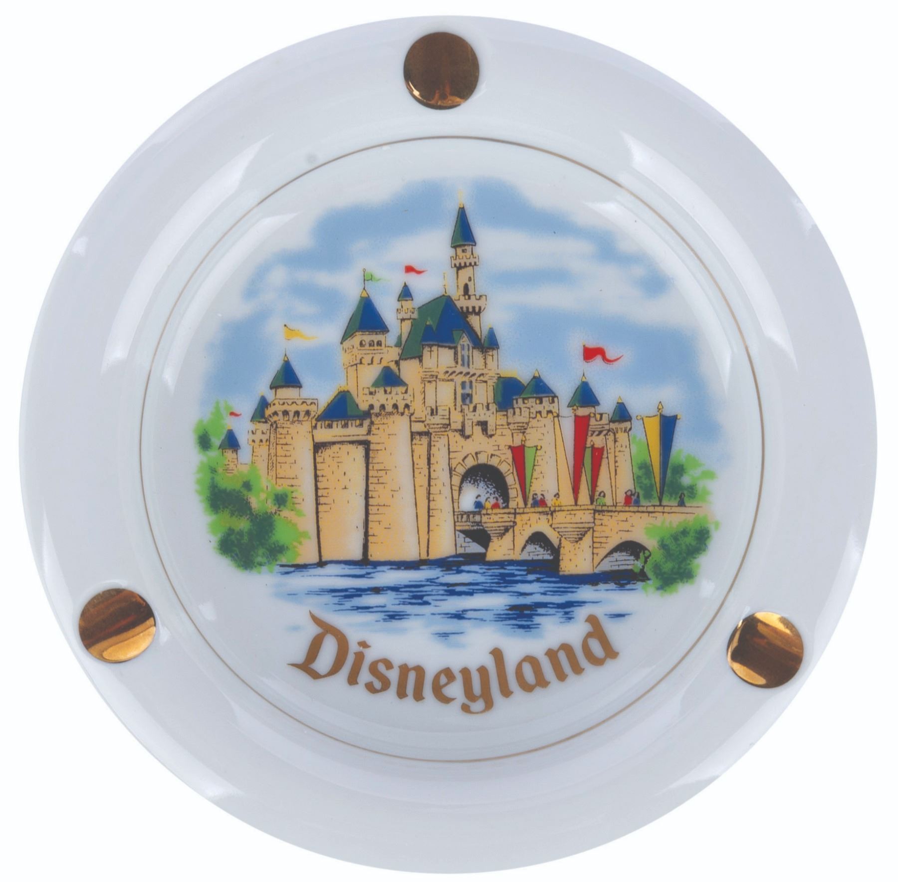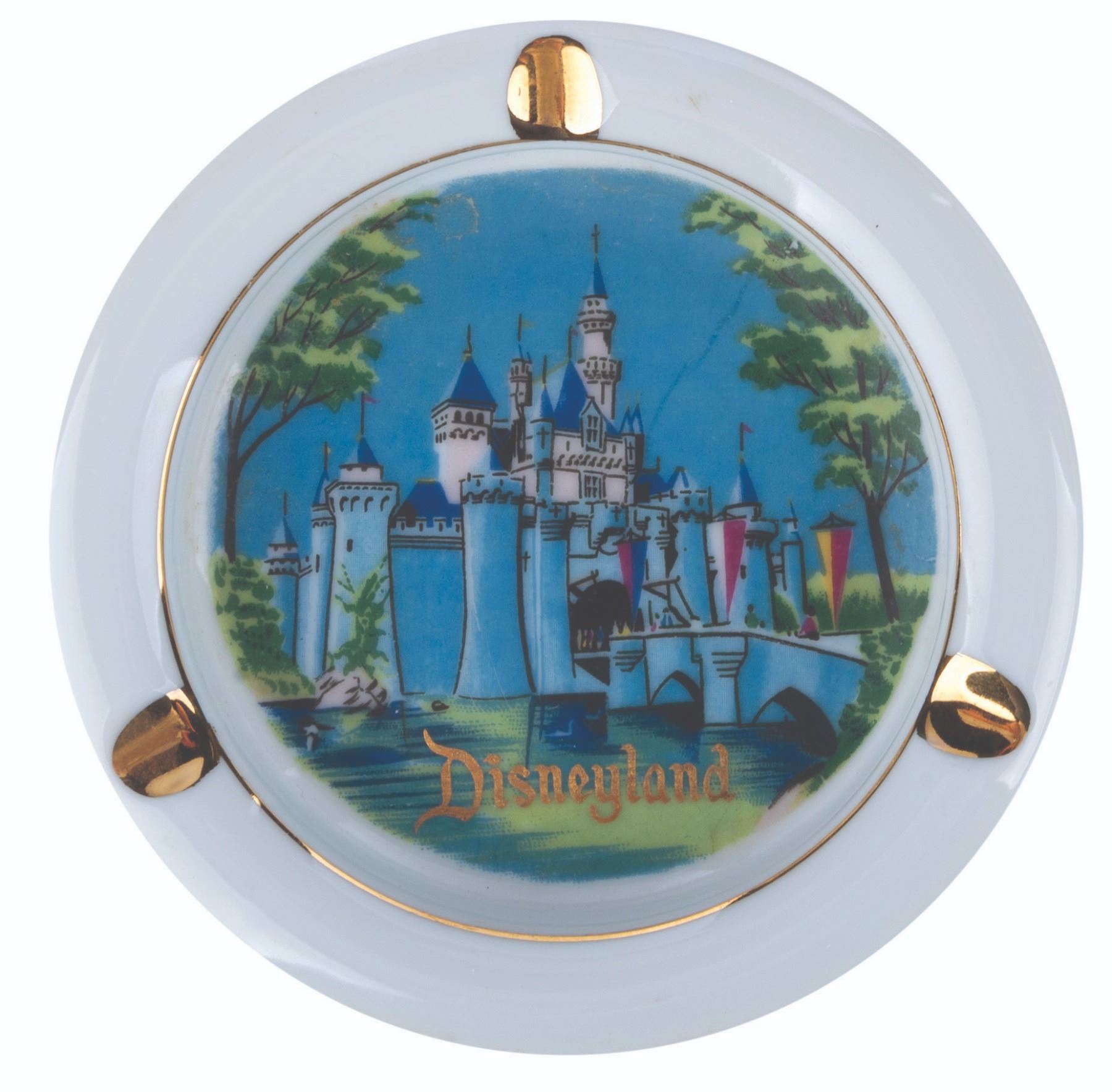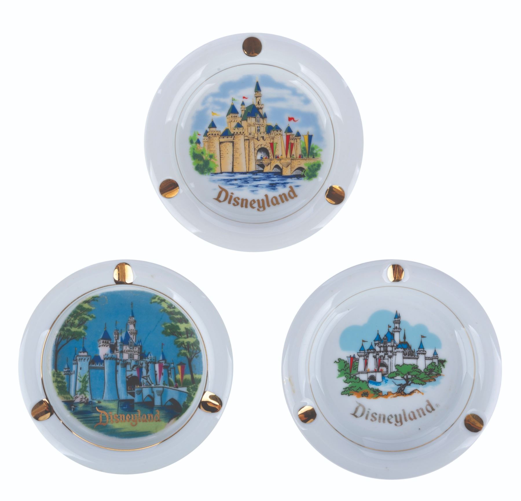 (Disneyland, 1960s-70s) A collection of (3) souvenir ashtrays featuring Sleeping Beauty Castle at Disneyland. The ashtrays have gold-finish edging and accents and were sold st Disneyland in the 1960s and 1970s. Each measure 5" in diameter, and are in very good to fine condition with a few minor scuffs and light wear.