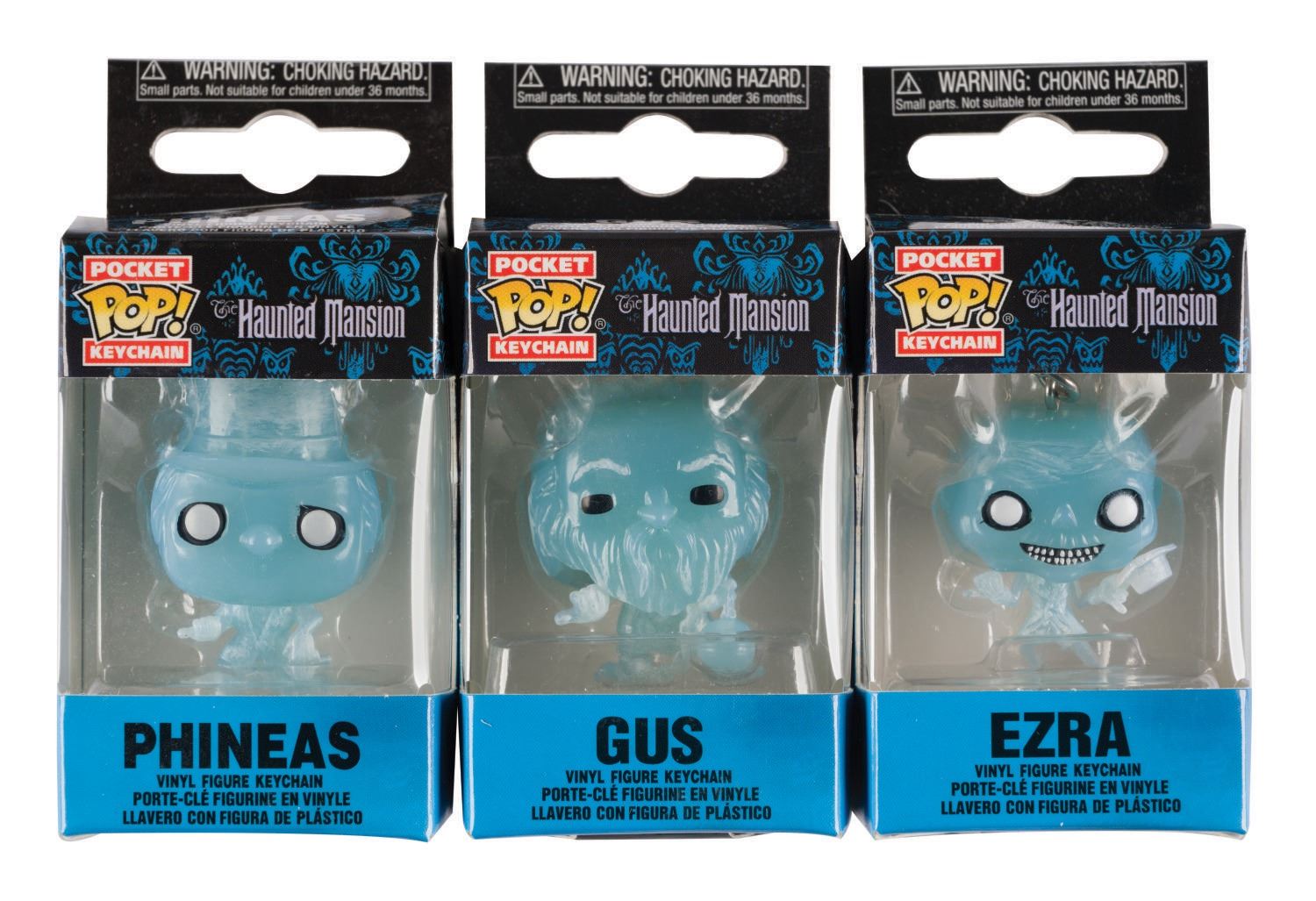 (Disneyland, 2019) A set of (3) Funko Pocket POP! Keychain Figures inspired by the Hitchhiking Ghosts of The Haunted Mansion at Disney Parks. Among the lot are Gus, Ezra, and Phineas, each offered to coincide with the 50th anniversary of the attraction at Disneyland Resort. Measuring 2" tall, each figure and box are in fine condition.
