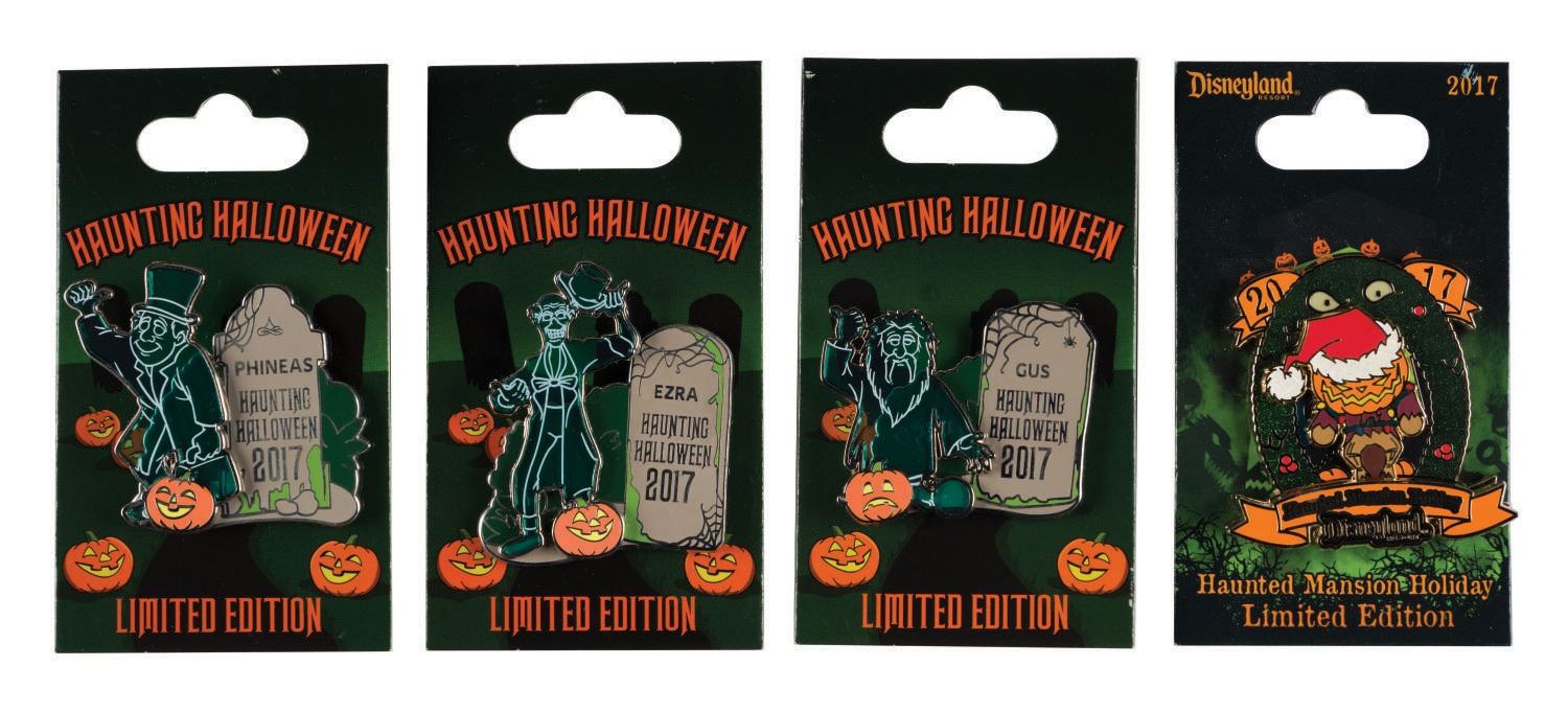 (Disney Parks, 2017) A set of (4) pins inspired by The Haunted Mansion at Disneyland and The Magic Kingdom. Among the lot are (3) limited edition Haunting Halloween pins featuring the Hitchhiking Ghosts and one Haunted Mansion Limited Edition slider pin. Measuring 1.5"x1.75" and 2"x1.75", the pins are in fine condition.