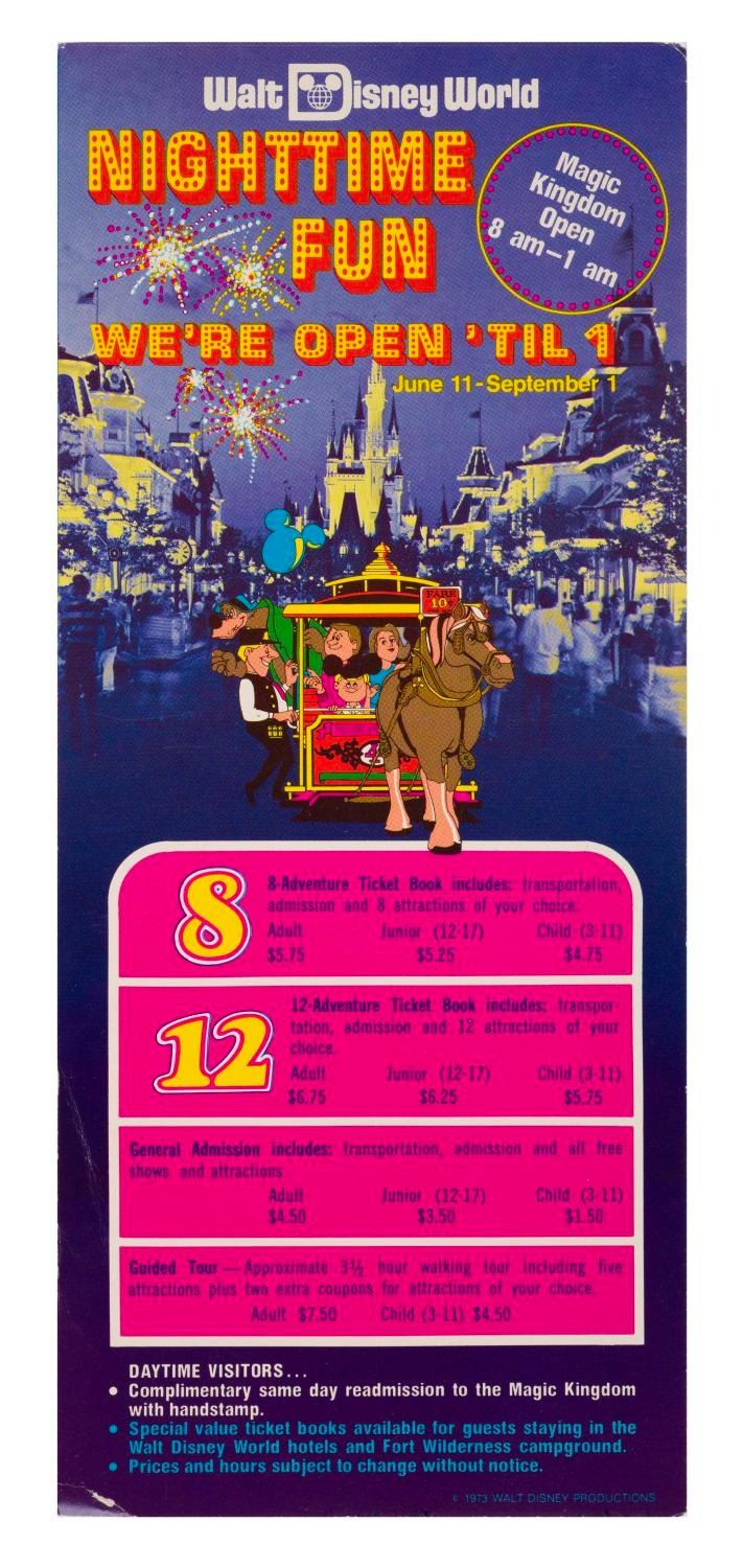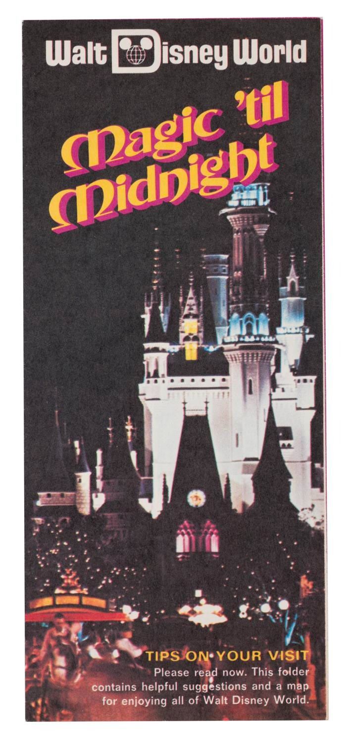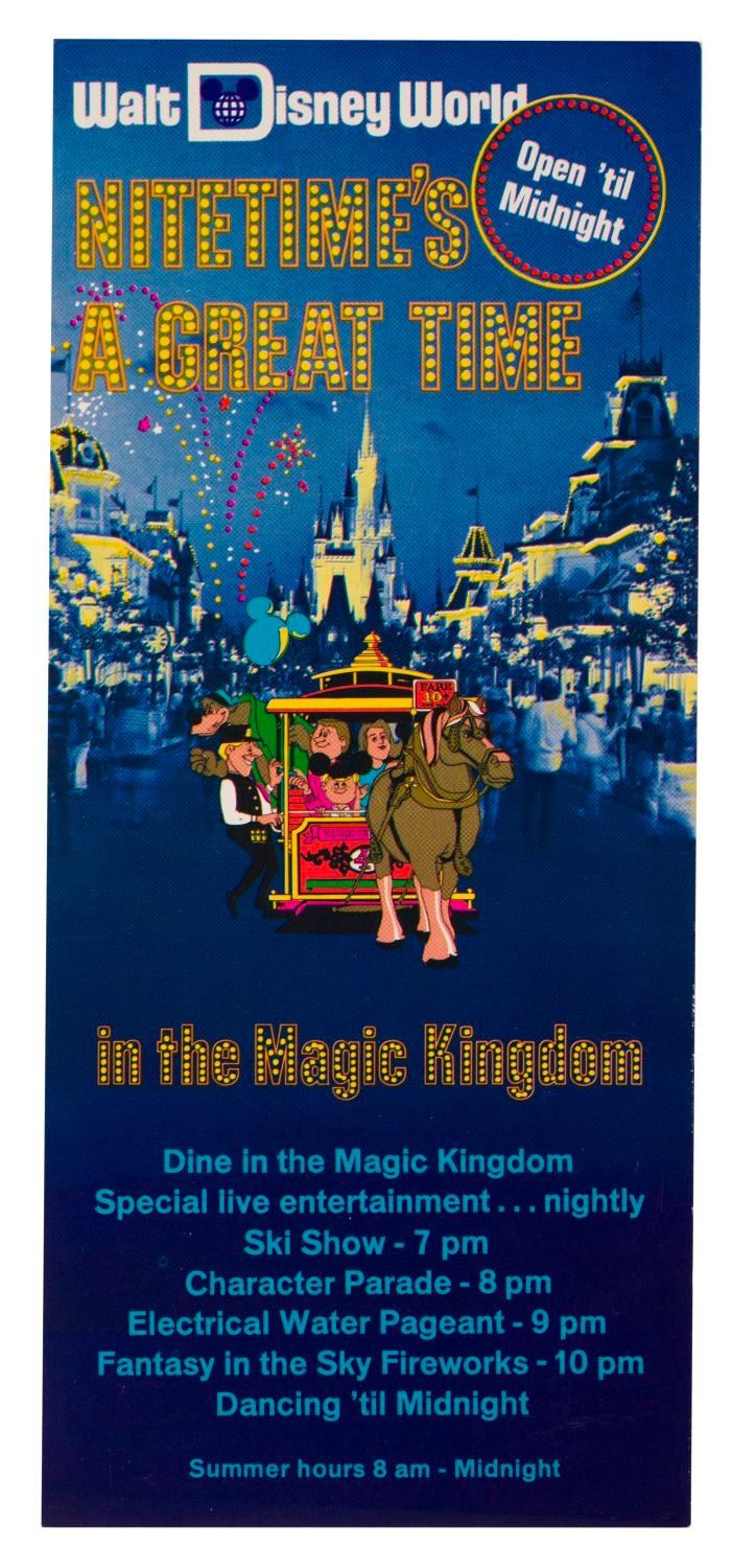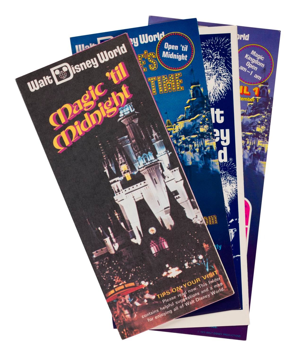 (Walt Disney World, 1970s) A set of (4) Walt Disney World entertainment fliers & guides announcing the entertainment, admission prices, and hours related to The Magic Kingdom. Measuring 3.75”x8.5” and 4”x9.5”, each piece is in very good condition with minor wear to their edges and corners.