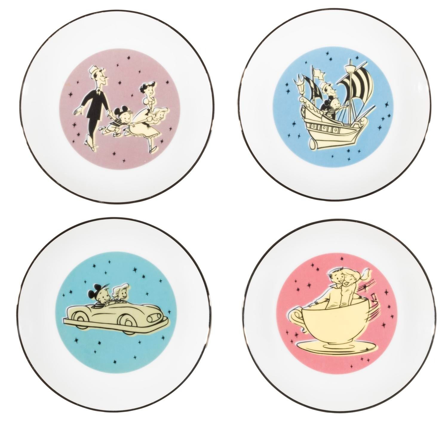 (Disneyland, 2000) A set of four retro-style plates designed by Kevin Kidney and Jody Daily commemorating the 40th anniversary of Disneyland. The 6" diameter plates are in fine condition and come in their original box.